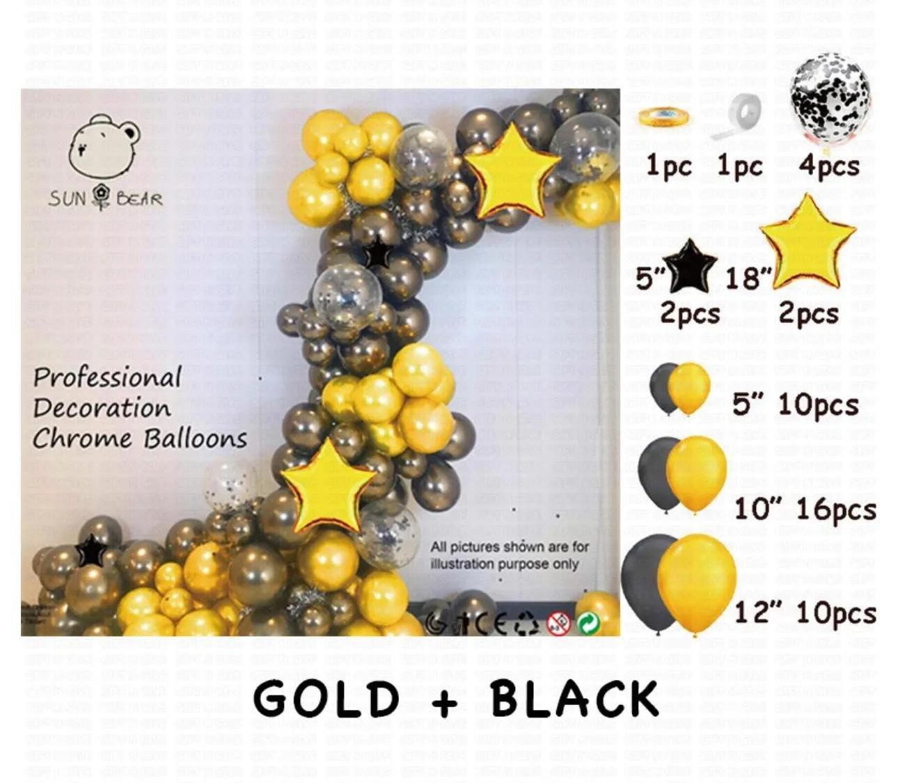 Setul Arcadă Baloane Aniversare – 46 piese, în combinație elegantă de auriu și negru, este un produs de decor en-gros conceput pentru realizarea rapidă a unor aranjamente spectaculoase pentru evenimente speciale. Paleta cromatică auriu delicat și negru metalizat oferă un efect vizual rafinat, potrivit atât pentru evenimente dedicate copiilor, cât și pentru petreceri elegante sau aniversări cu tematică modernă.