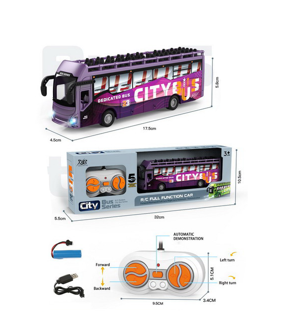Autobuzul are o lungime generoasă de aproximativ 28 cm, oferind o prezență impunătoare pe pistele de joacă improvizate. Analizând funcționalitatea, acesta dispune de 5 funcții de control: deplasare înainte/înapoi, viraj stânga/dreapta și oprire, toate acționate printr-o telecomandă ergonomică pe frecvența de 2.4 GHz (ce permite joaca simultană fără interferențe). Designul supraetajat este completat de un sistem de iluminare LED care se activează în timpul mersului, oferind un aspect fascinant în condiții de lumină scăzută. Un avantaj major este sistemul de alimentare: autobuzul include un acumulator reîncărcabil prin cablu USB, eliminând costurile suplimentare cu bateriile de unică folosință și asigurând sesiuni de joacă prelungite.