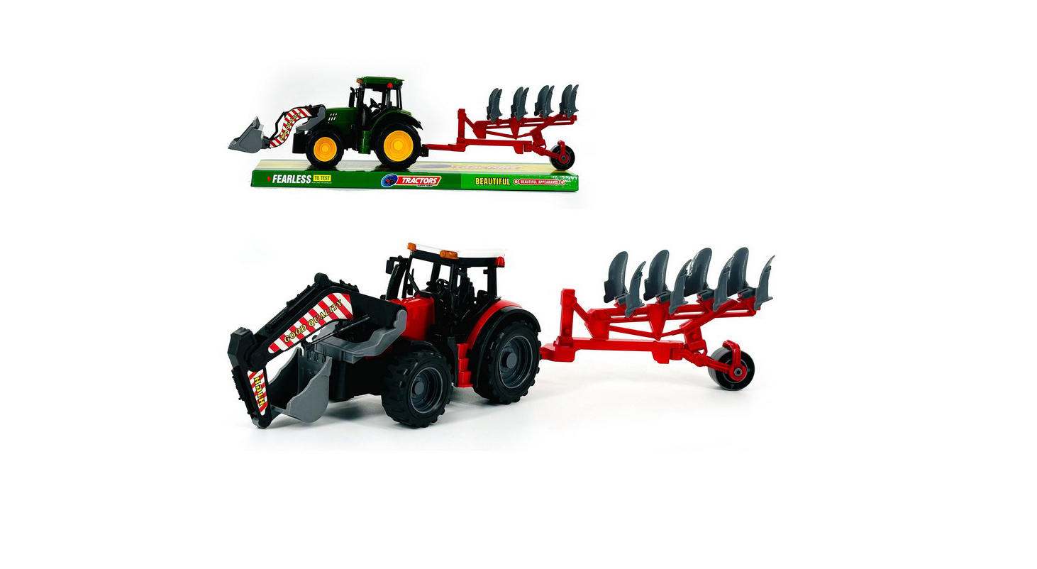 Analizând detaliile vizuale, tractorul robust (disponibil în culorile verde sau roșu) este echipat cu un încărcător frontal articulat, dotat cu o cupă spațioasă care poate fi ridicată și coborâtă manual. În spatele tractorului se află piesa centrală a setului: un plug de arat detaliat, de culoare galbenă sau verde, prevăzut cu mai multe rânduri de lame stilizate pentru a imita procesul de pregătire a solului. Întregul ansamblu are o lungime totală de 28 cm, mărime care facilitează manevrarea pe covor sau în spații de joacă exterioare, stimulând coordonarea mână-ochi și imaginația prin activități tematice complexe.
