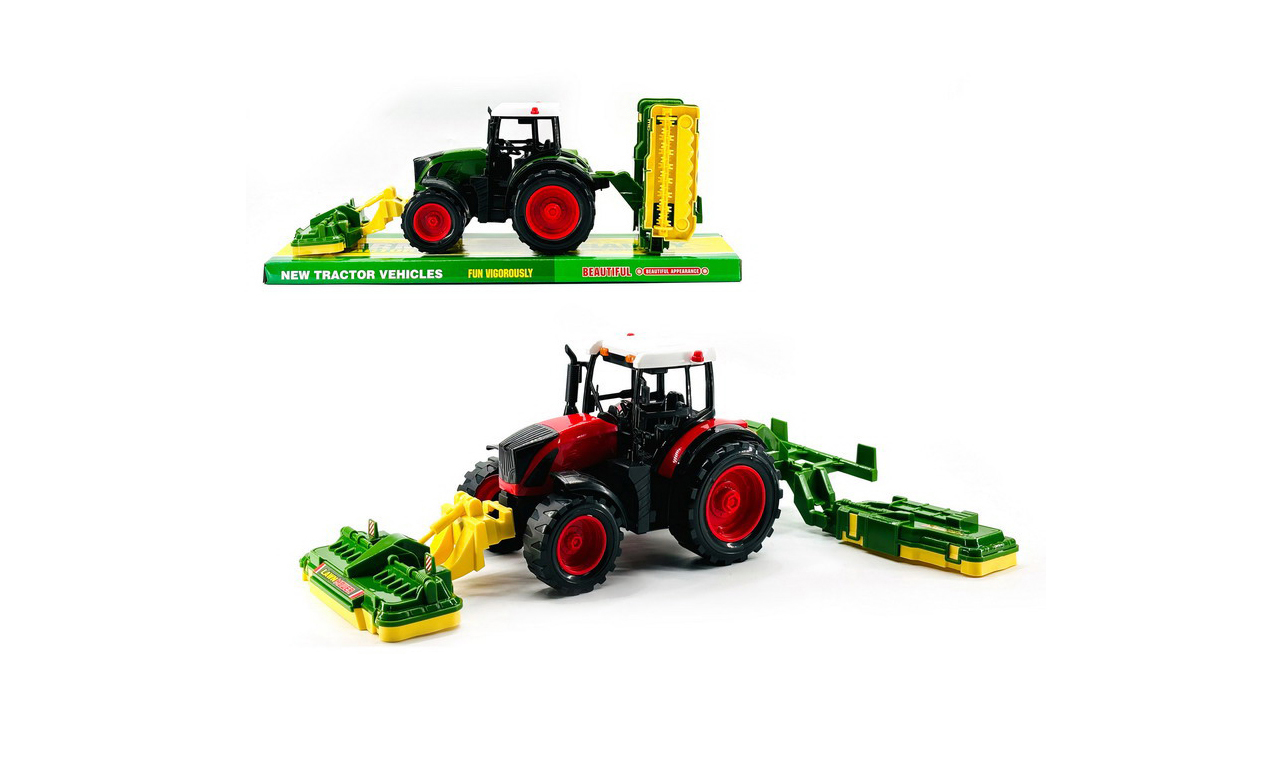 Elementul distinctiv al acestui model este sistemul de cosit format din trei unități independente: o cositoare frontală și două cositori laterale montate pe un suport posterior. Toate cele trei unități sunt articulate, permițând ridicarea lor în poziție de transport sau coborârea pentru „lucru”. Această funcționalitate le oferă copiilor posibilitatea de a simula procesul de tăiere a ierbii pe lățimi mari, dezvoltându-le coordonarea și atenția la detalii. Cu o lungime totală de 32 cm, ansamblul este fabricat din plastic durabil, capabil să reziste la utilizarea pe covor sau afară, în iarbă reală. Detaliile mecanice, roțile cu profil agricol și culorile vibrante fac din acest tractor un utilaj de nelipsit, reprezentând o oportunitate strategică pentru vânzarea angro.