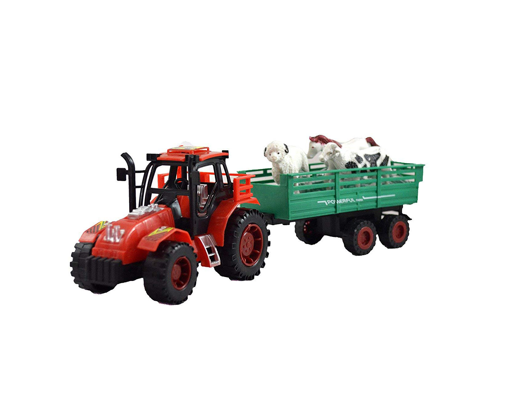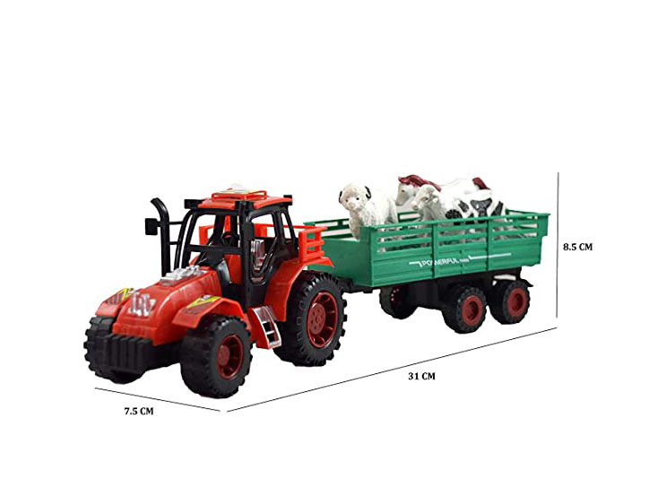 Setul include un tractor robust, o remorcă spațioasă și figurine reprezentând animale domestice, oferind copiilor posibilitatea de a recrea scenarii realiste din activitățile zilnice ale unei ferme. Designul tractorului este inspirat din utilajele agricole reale, cu o cabină bine conturată, roți mari, profilate, și detalii vizibile care sporesc realismul jocului. Remorca este concepută pentru transportul animalelor, având pereți laterali care mențin figurinele în siguranță în timpul jocului.