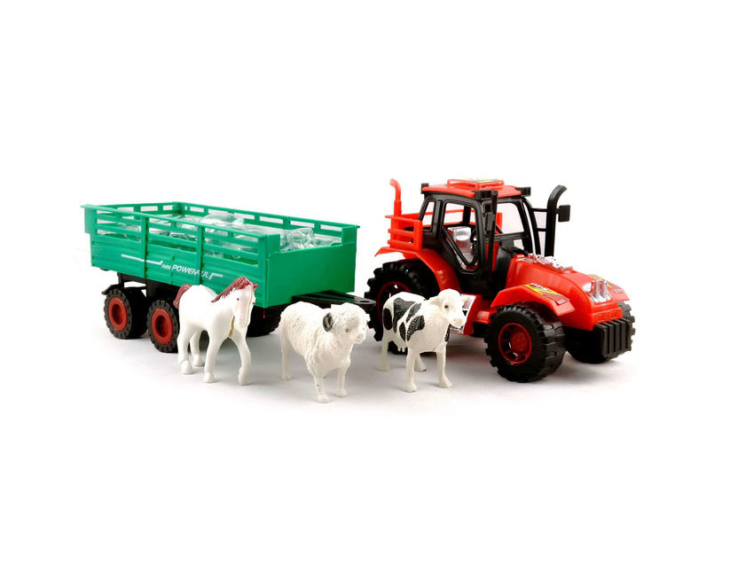 Tractorul este realizat din material plastic rezistent, cu roți mari, bine profilate, care permit deplasarea ușoară pe diferite suprafețe. Designul robust și culorile vii îl fac atractiv pentru copii, iar dimensiunile generoase permit o manipulare confortabilă chiar și pentru mâini mici. Remorca atașată tractorului este spațioasă și prevăzută cu laterale înalte, fiind ideală pentru transportul animalelor incluse în set.
