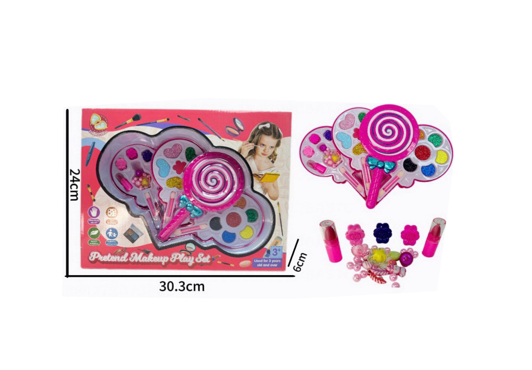 Setul conține multiple compartimente cu farduri colorate, sclipici, accesorii decorative și elemente de machiaj jucărie, organizate într-o carcasă compactă, ușor de transportat. Toate culorile sunt vii, cu tematică dulce și jucăușă, potrivite pentru joaca simbolică a copiilor. Trusa este realizată din materiale ușoare, cu margini rotunjite, adaptate utilizării de către cei mici.