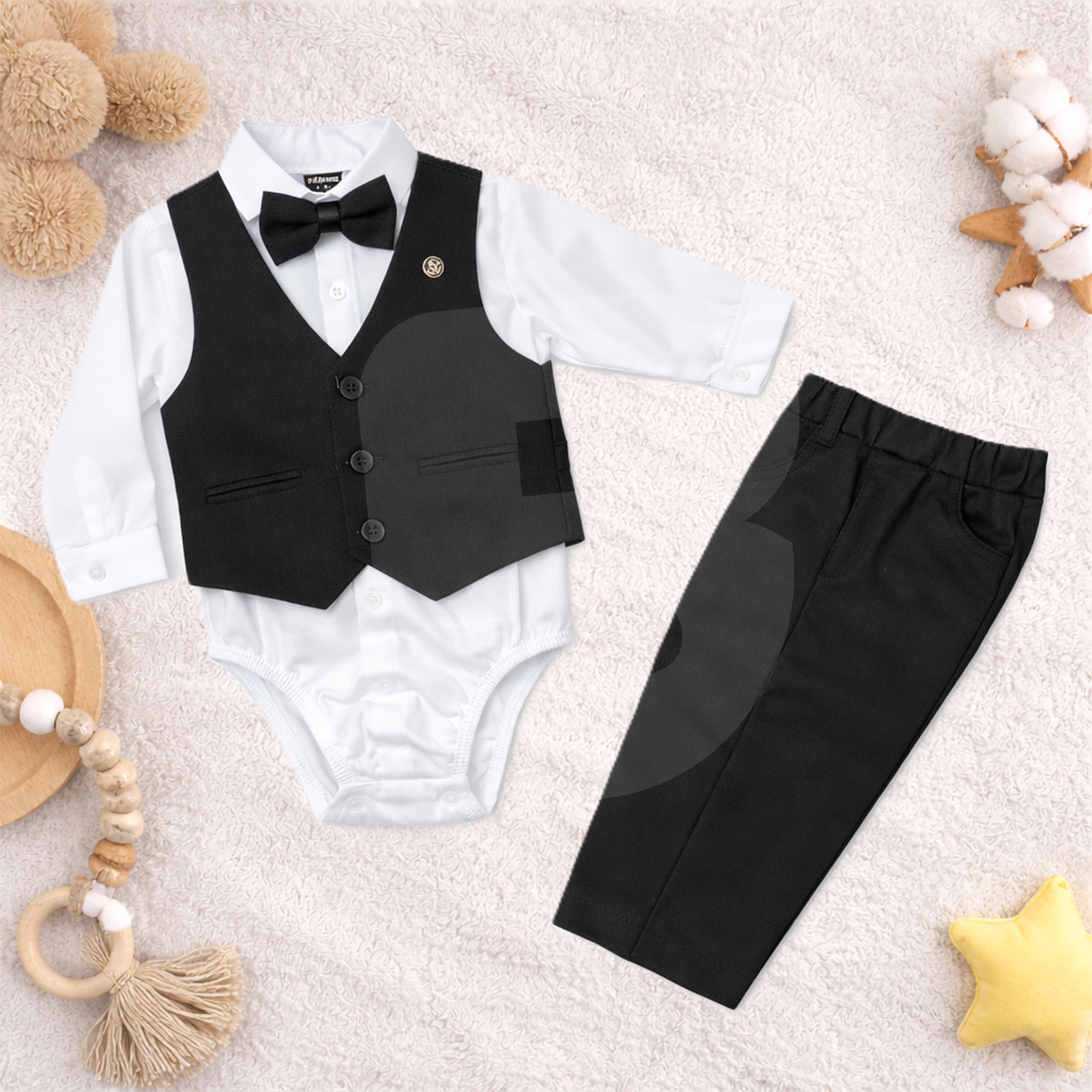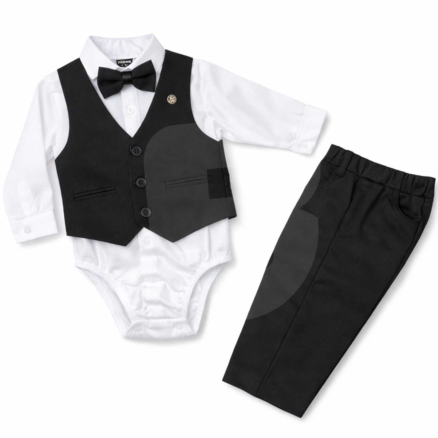 Fiecare costum este compus din 4 piese: body tip cămașă albă cu mânecă lungă, vestă elegantă neagră, papion asortat și pantaloni negri, realizând o ținută completă, clasică și bine proporționată pentru bebeluși. Designul este atent finisat, cu nasturi decorativi pe vestă și croială confortabilă, adaptată vârstei fragede.