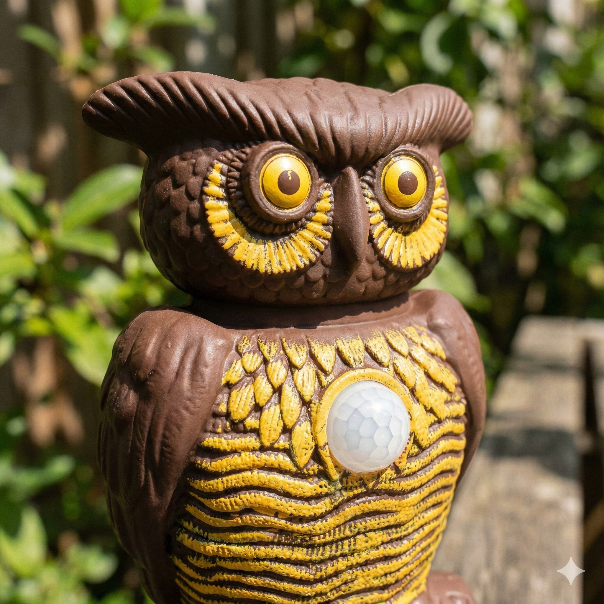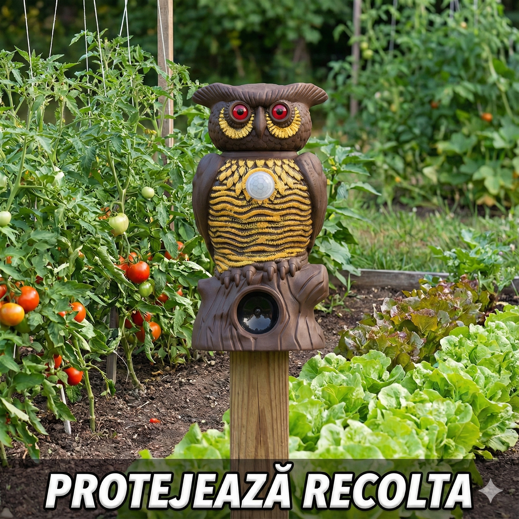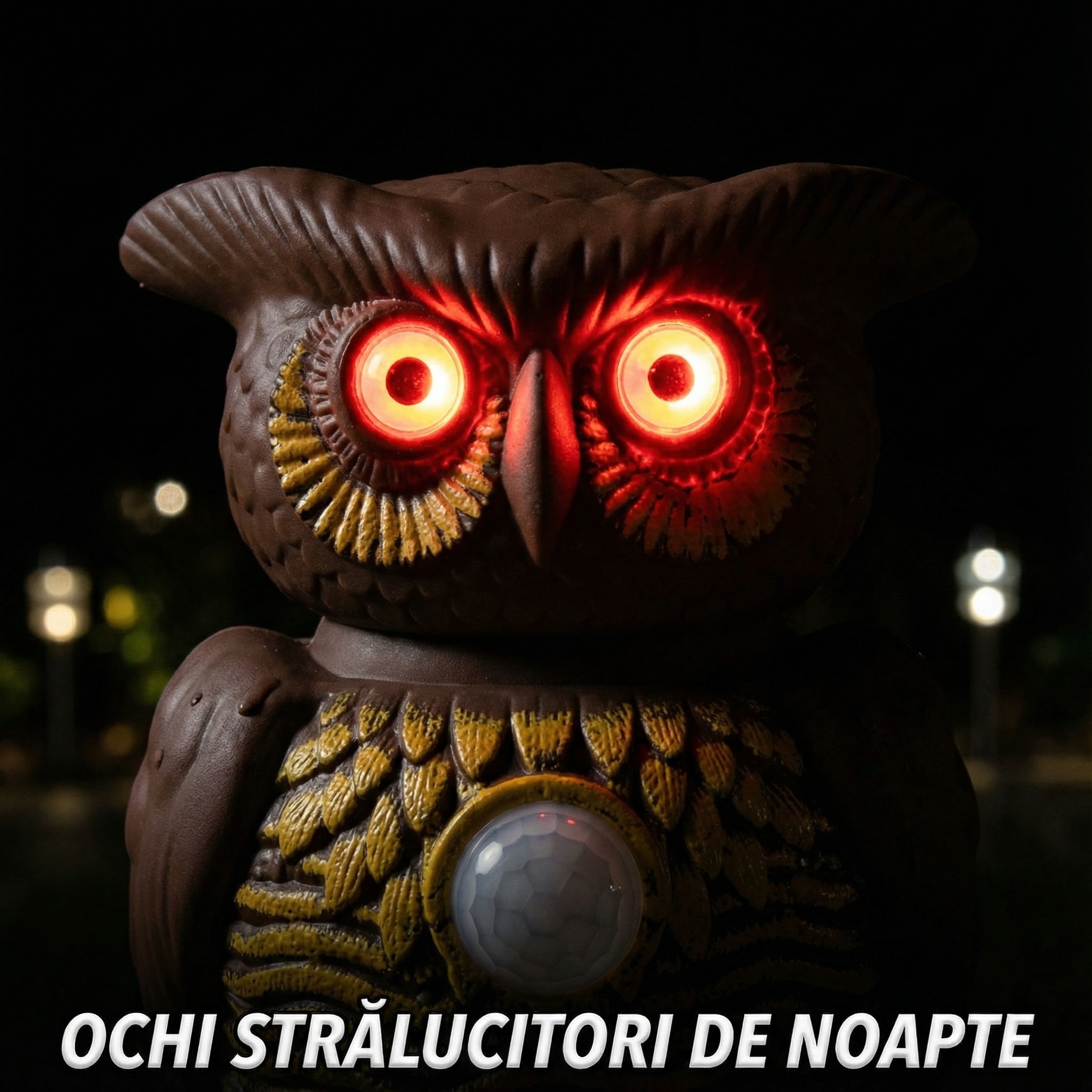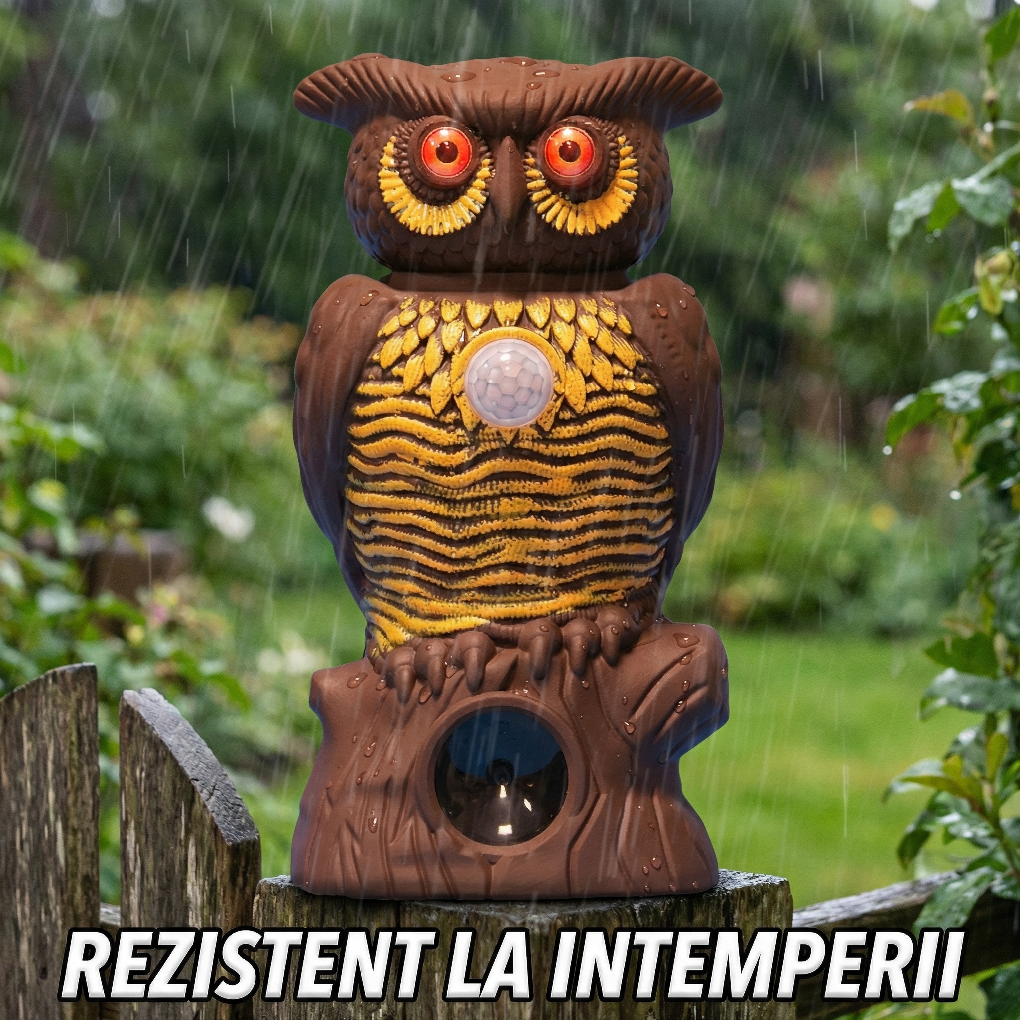 Aparatul nostru model Bufniță nu este doar o decorațiune de grădină reușită. În spatele ochilor săi mari și a designului realist se ascunde o tehnologie avansată de respingere a dăunătorilor. Dotată cu un senzor de mișcare sensibil, bufnița "se trezește" instantaneu atunci când detectează intrușii. Combinația șocantă de ultrasunete puternice și ochi roșii luminoși intermitenți creează un disconfort imens pentru porumbei, vrăbii, grauri și șoareci, determinându-i să părăsească zona imediat.