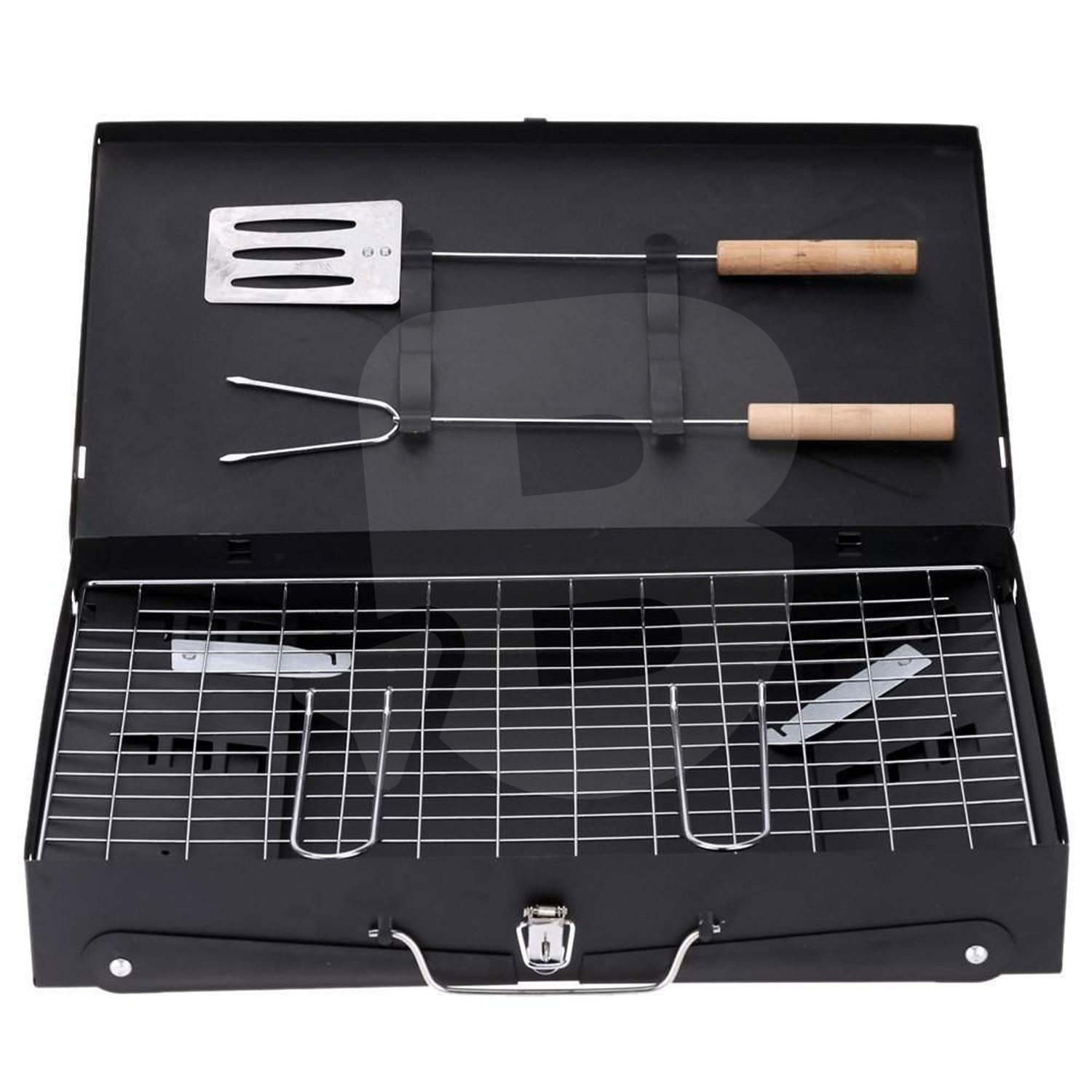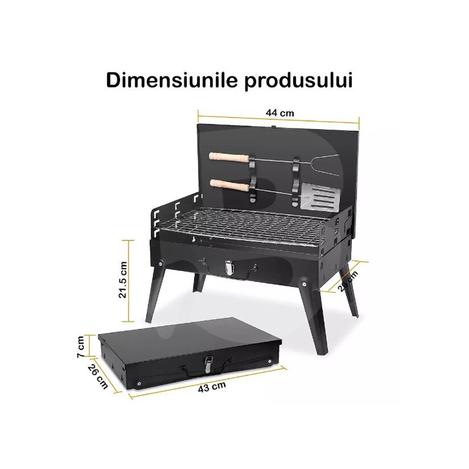 Un element esențial al acestui grătar camping este capacul rabatabil, prevăzut cu suporturi dedicate pentru ustensilele de gătit. Acest sistem optimizează spațiul de lucru și permite organizarea eficientă în timpul preparării alimentelor. Setul include accesorii BBQ utile, precum spatulă și furculiță, echipate cu mânere din lemn pentru o manipulare sigură și confortabilă.