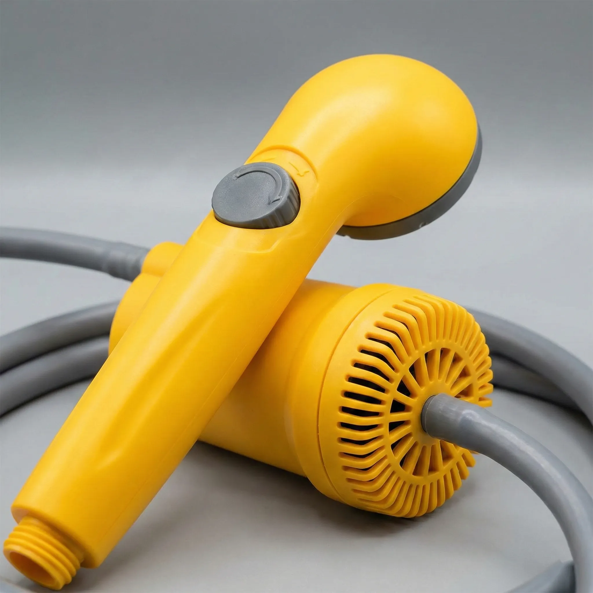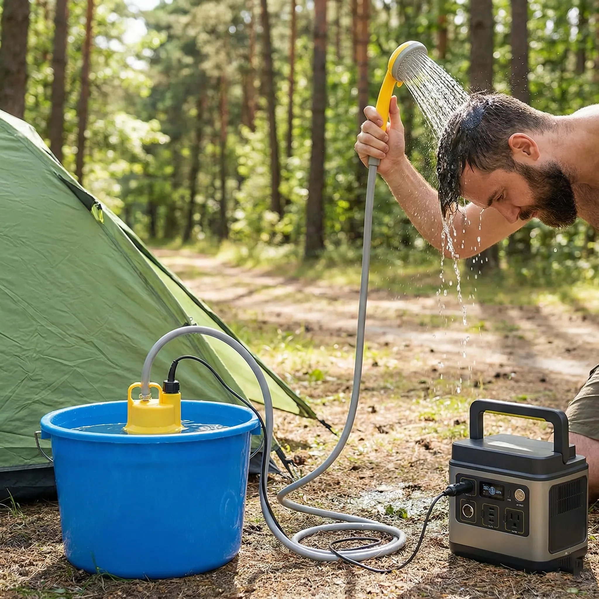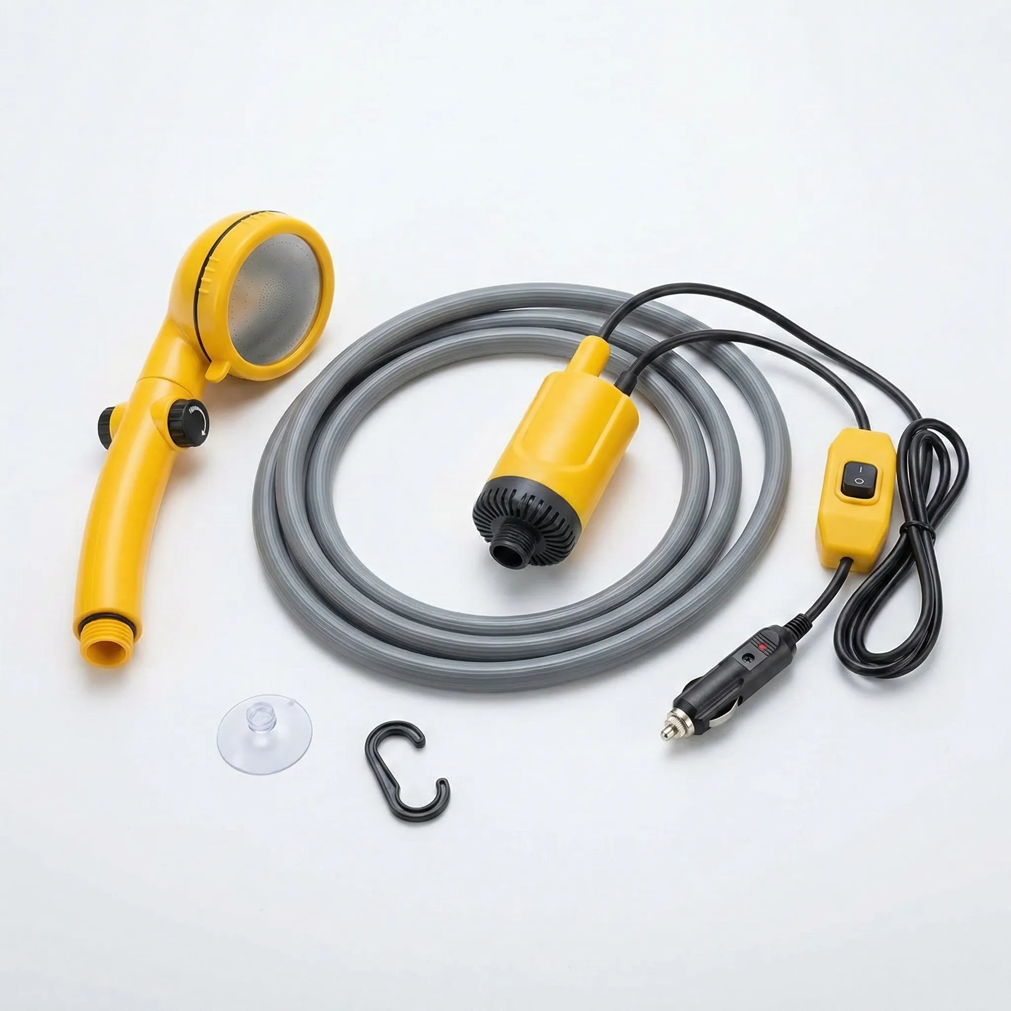 Conectare Simplă și Rapidă la 12V: Nu depinzi de facilitățile locurilor de campare. Dușul este proiectat să funcționeze excelent alimentat direct de la priza brichetei auto (12V). Doar conectezi cablul, introduci pompa într-un recipient cu apă și sistemul este gata de utilizare în câteva secunde.