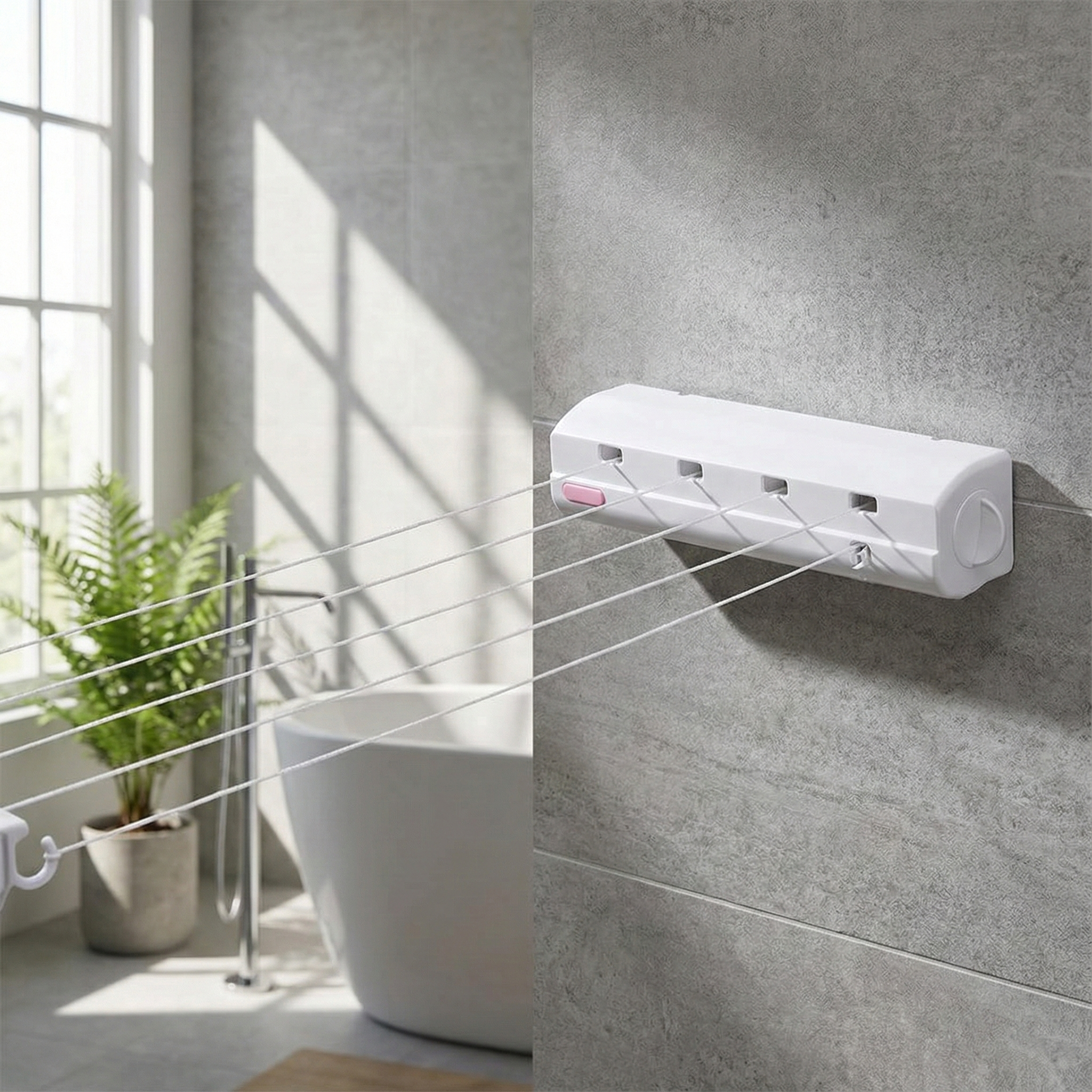 Acest sistem inteligent este conceput pentru locuințele moderne, unde fiecare centimetru contează. Funcționează simplu și eficient: îl extinzi doar atunci când ai nevoie să întinzi rufele, iar în restul timpului se retrage discret într-o carcasă elegantă, lăsând spațiul liber. Cele 5 sfori rezistente îți oferă o suprafață de uscare surprinzătoare, suficientă pentru a susține până la 50 de articole de îmbrăcăminte simultan, de la tricouri și prosoape, până la lenjerii de pat.