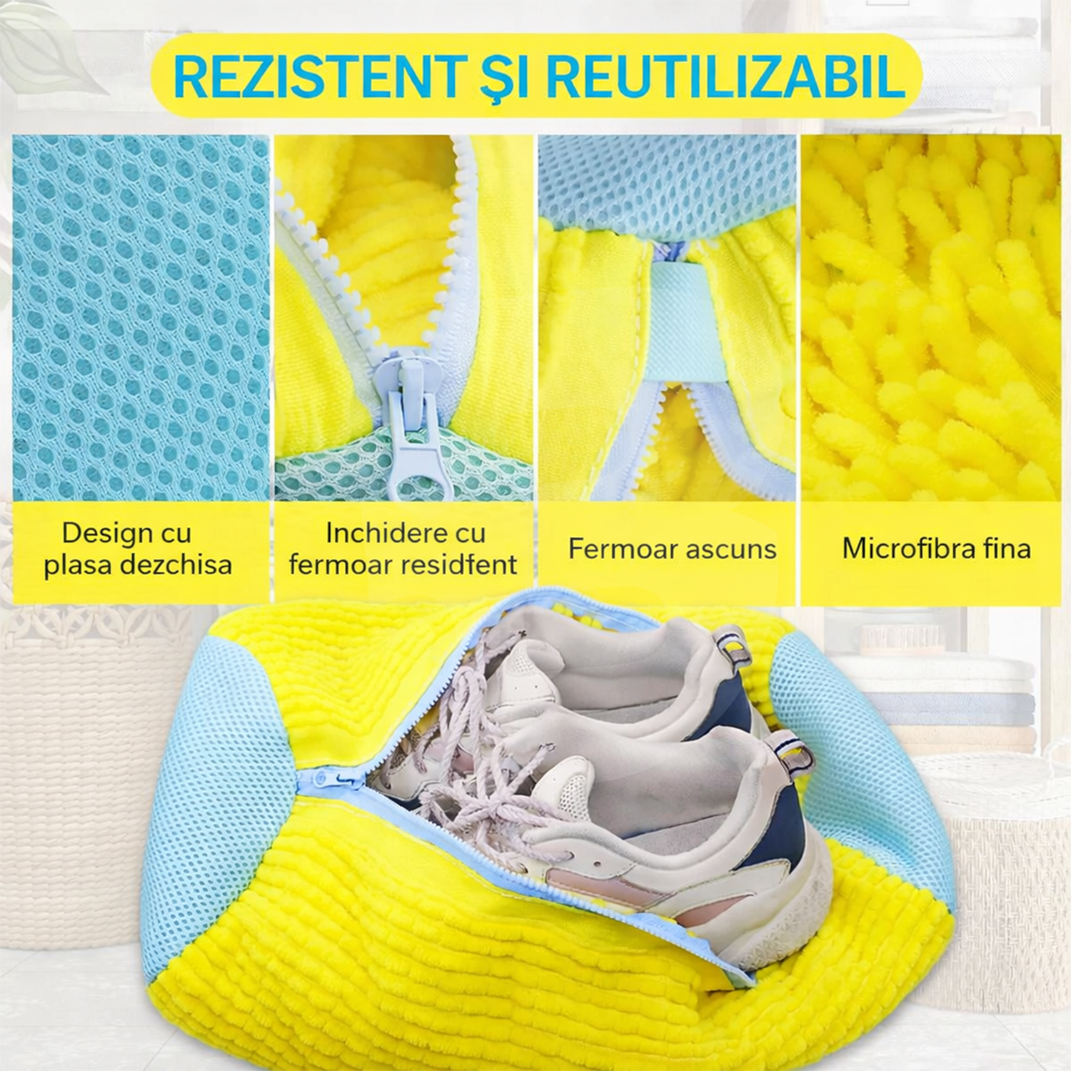 Modul de utilizare este simplu: pantofii se introduc în sac, fermoarul se închide complet, iar sacul se adaugă în mașina de spălat împreună cu detergentul obișnuit. Microfibra chenille ajută la absorbția excesului de apă, reducând timpul de uscare și limitând apariția mirosurilor neplăcute.