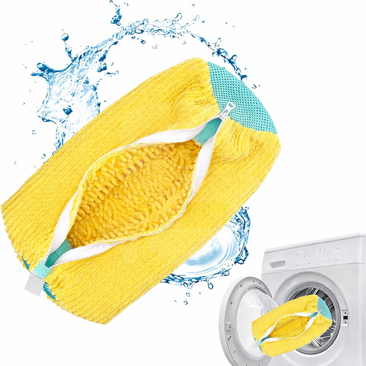 Realizat din microfibră chenille densă, sacul oferă o amortizare excelentă în timpul ciclurilor de spălare. Structura interioară moale și elastică protejează pantofii sport, încălțămintea casual sau pantofii pentru copii împotriva lovirii de cuva mașinii de spălat, menținând forma naturală a acestora. Materialul chenille este recunoscut pentru capacitatea sa de absorbție, contribuind la reducerea zgomotului, a vibrațiilor și a riscului de deteriorare a mașinii de spălat.