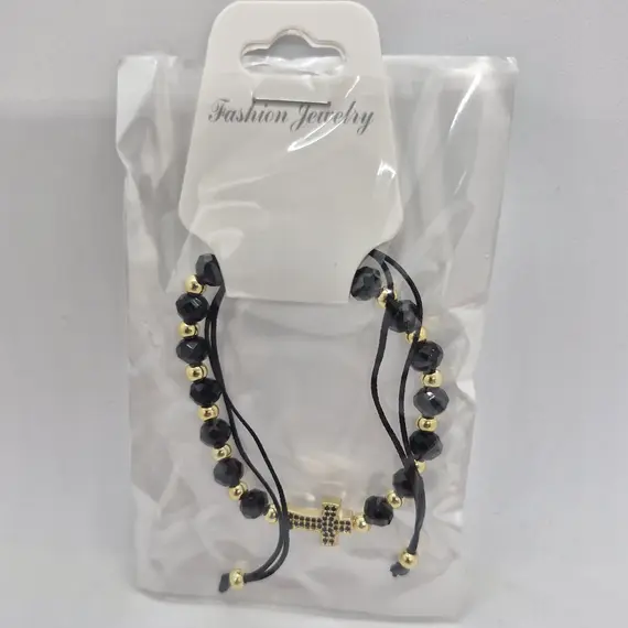 Această brățară en-gros îmbină simplitatea cu eleganța, fiind ideală pentru comercianți care doresc să ofere clienților bijuterii moderne și accesibile. Construită pe șnur negru rezistent, cu mărgele negre fațetate și biluțe aurii strălucitoare, are ca element central o cruce aurie, simbolică și rafinată.