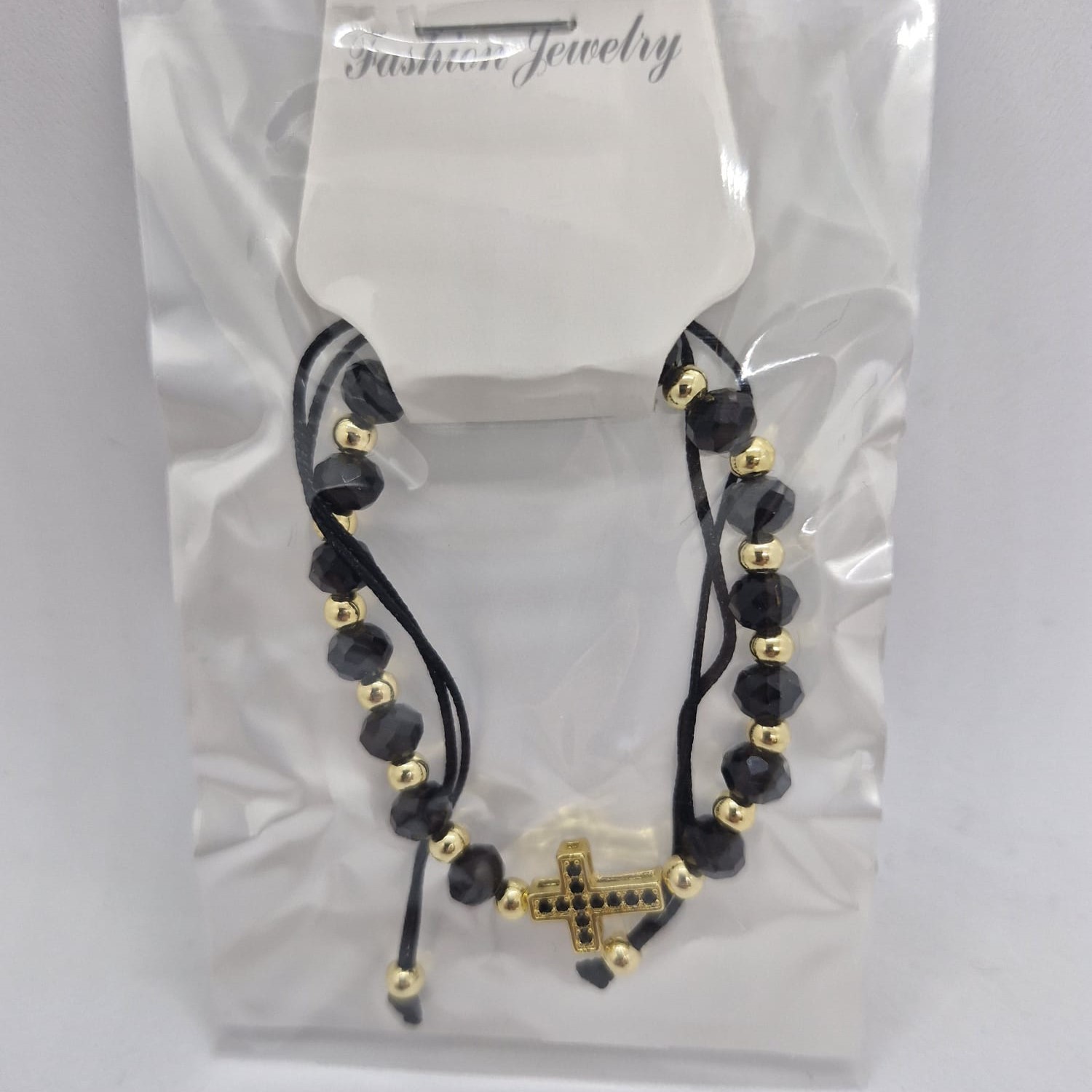 Această brățară en-gros este un accesoriu modern și elegant, ideal pentru comercianți care doresc să ofere clienților bijuterii la modă și accesibile. Realizată din șnur negru rezistent, cu mărgele negre fațetate și biluțe aurii strălucitoare, brățara are ca element central o cruce aurie cu detalii negre, ce adaugă rafinament și simbolistică.