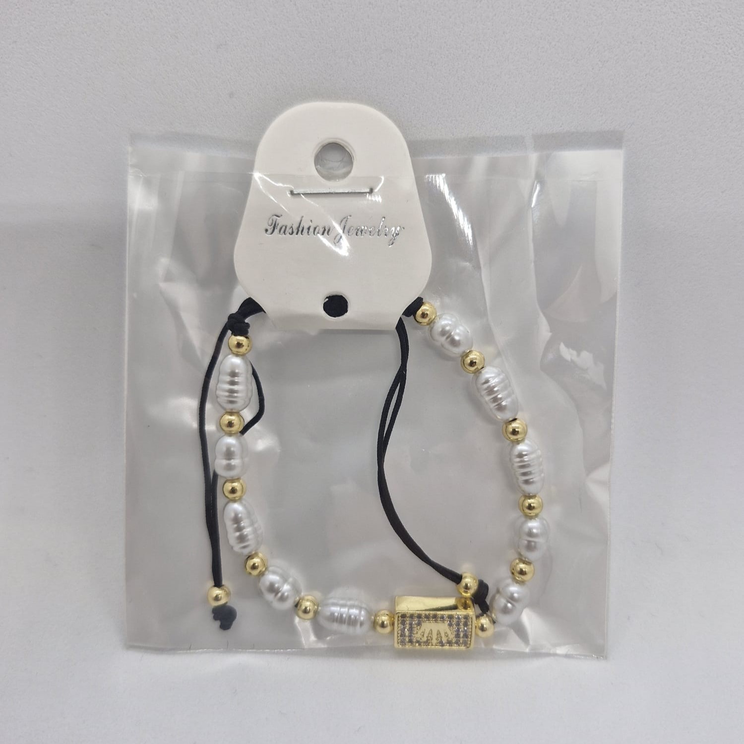 Această brățară en-gros îmbină eleganța perlelor cu strălucirea detaliilor aurii, fiind o alegere deosebită pentru comercianți ce doresc să ofere clienților bijuterii accesibile și atractive. Realizată pe șnur negru reglabil, este decorată cu mărgele albe tip perlă, biluțe aurii lucioase și un element central dreptunghiular gravat, ce adaugă rafinament și unicitate.