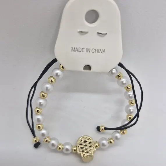 Această brățară en-gros combină finețea perlelor albe cu strălucirea biluțelor aurii, oferind un accesoriu modern și versatil. Realizată pe șnur negru reglabil, este ușor de purtat și potrivită pentru diverse ocazii, de la ținute casual la elegante. Elementul central auriu, cu design decorativ, adaugă un plus de stil și rafinament.