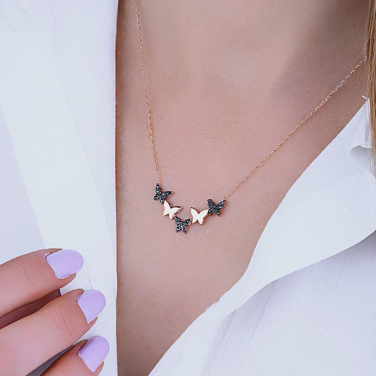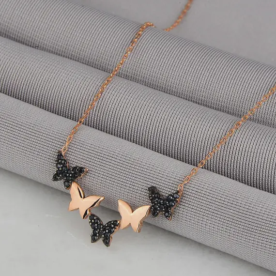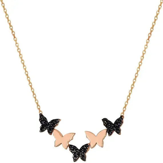 Adaugă o notă de eleganță unică ținutelor tale cu acest colier fluture din argint 925 placat cu aur roz, decorat cu o piatră neagră misterioasă. Designul său delicat simbolizează transformarea, libertatea și feminitatea, fiind un accesoriu ideal pentru fiecare zi sau pentru ocazii speciale.