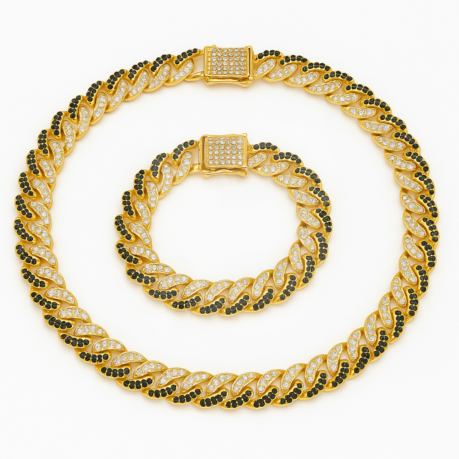 Setul de lanț și brățară Cuban în nuanță aurie intensă, pavate cu microcristale albe și negre, este un accesoriu fashion de lux, conceput pentru comercianții en-gros care doresc produse cu impact vizual maxim, finisaj impecabil și aspect premium. Acest model impresionează prin combinația dintre aurul strălucitor, cristalele albe cu efect pavé și accentele negre elegante, creând un set exclusivist, extrem de atrăgător în prezentări, vitrine și fotografii comerciale.