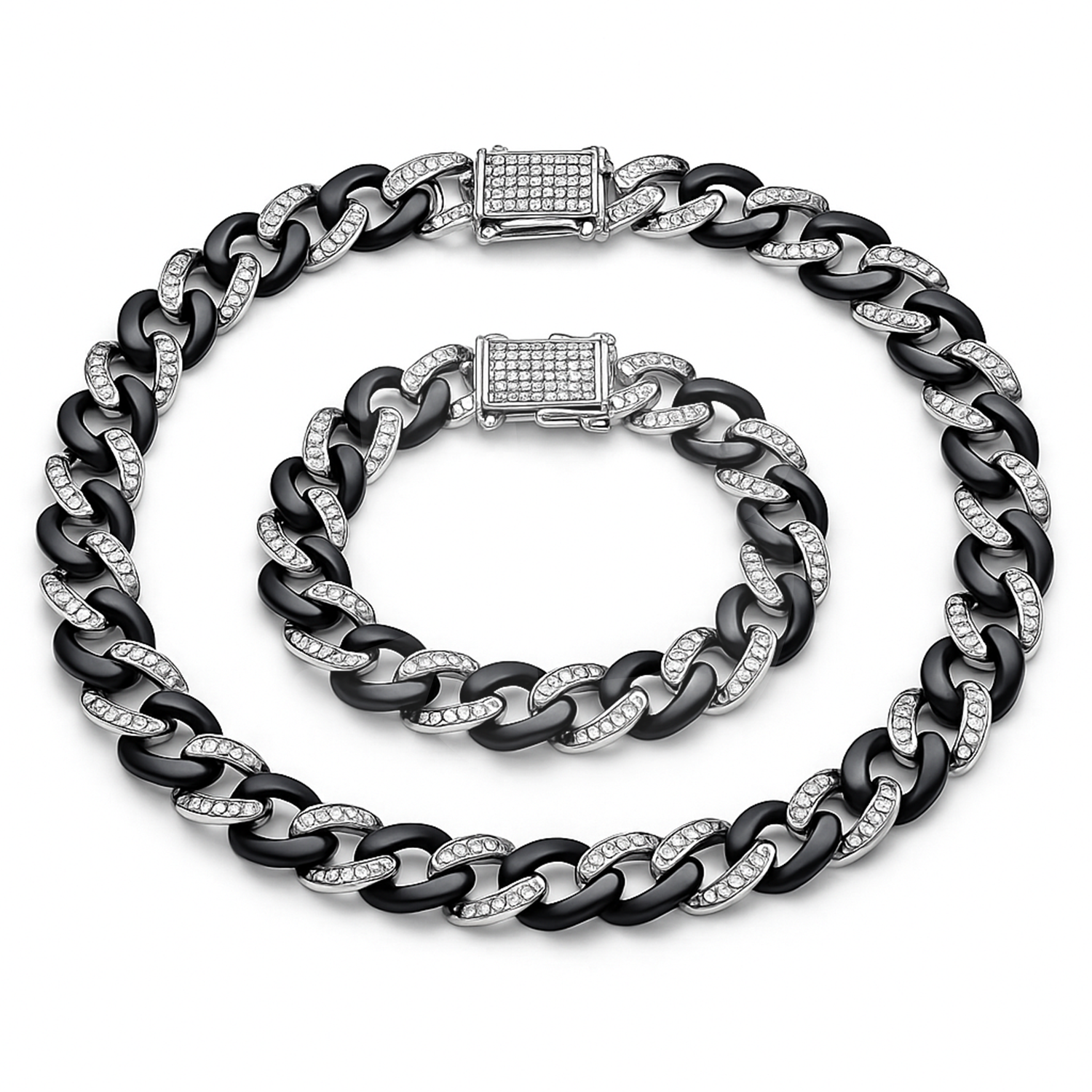 Setul de lanț și brățară model Cuban în combinația bicoloră negru–argintiu cu microcristale, este un accesoriu fashion modern, elegant și extrem de vizibil, ideal pentru comercianții en-gros care doresc să includă în ofertă articole cu impact vizual puternic și aspect premium. Modelul se remarcă prin contrastul spectaculos dintre zalele negre lucioase și zalele argintii pavate cu cristale, creând un design contemporan perfect pentru colecții de lux accesibil.