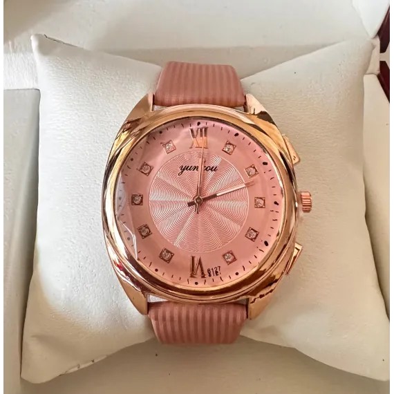 Carcasa metalică cu finisaj rose gold oferă ceasului un look sofisticat și actual. Forma rotundă este bine proporționată pentru încheietura feminină, iar marginile lucioase pun în valoare cadranul decorativ. Cadranul este disponibil în mai multe variante cromatice, precum roz pudrat, alb perlat, negru elegant, verde pastel sau roșu intens, fiecare variantă fiind accentuată de cristale aplicate la marcajele orare. Aceste detalii conferă un plus de strălucire fără a încărca vizual designul.