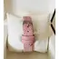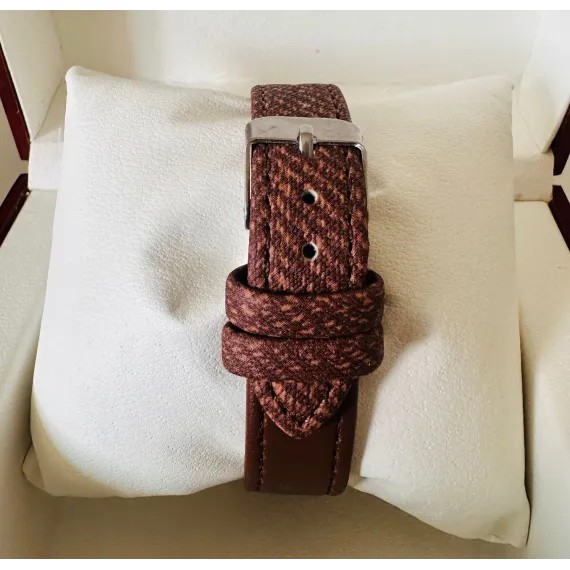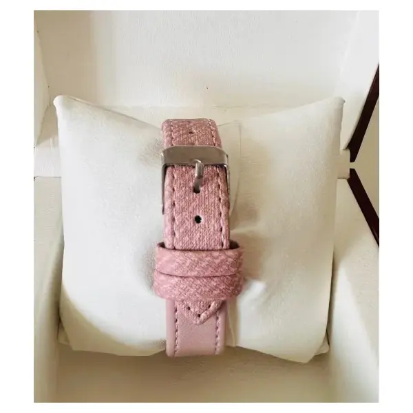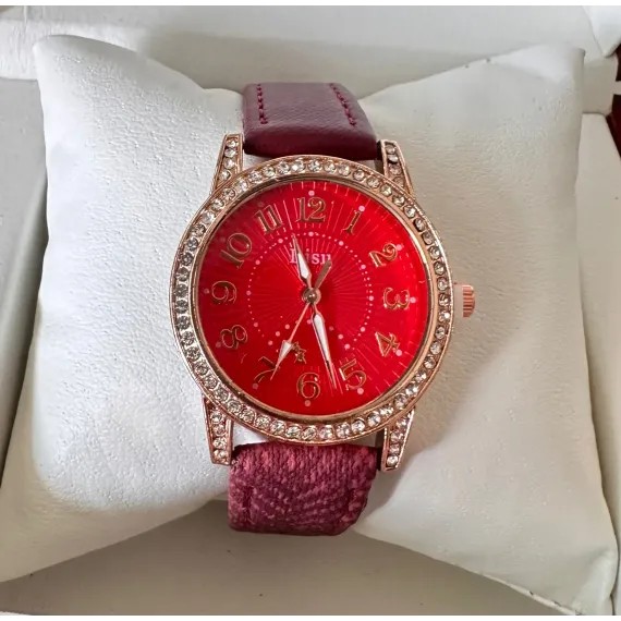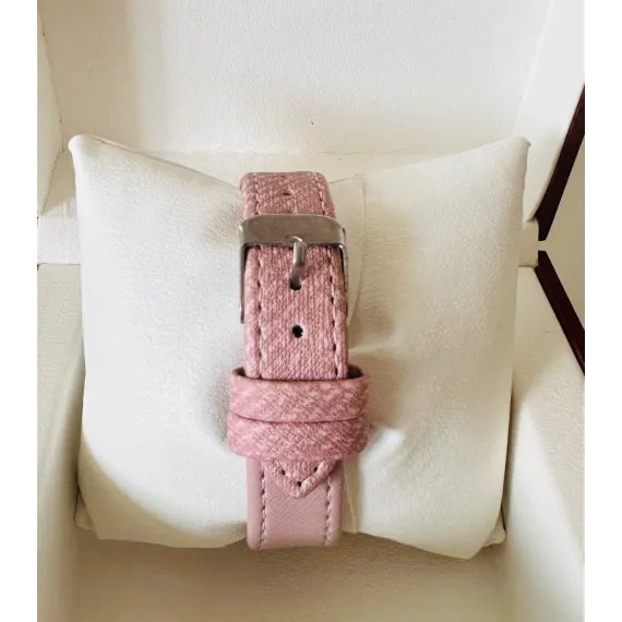 Cadranul este disponibil în mai multe variante cromatice – roz, negru, maro, roșu, albastru, alb sau verde – fiecare cu textură radială subtilă care creează un joc elegant de lumini. Cifrele sunt reliefate și ușor de citit, iar acele metalice sunt bine contrastate pentru o lizibilitate bună. Aspectul general este feminin și modern, potrivit atât pentru ținute de zi, cât și pentru apariții elegante.