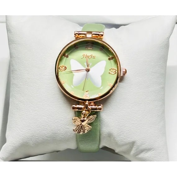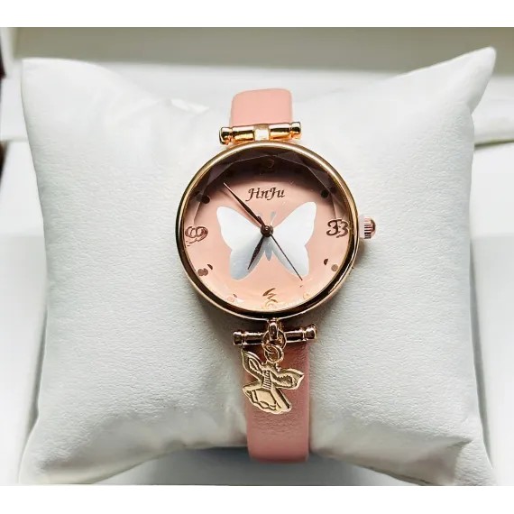 Un element distinctiv al acestui model este pandantivul decorativ sub formă de fluture, atașat elegant la baza carcasei. Acest detaliu adaugă un plus de rafinament și diferențiază produsul față de ceasurile clasice, transformându-l într-un accesoriu cu valoare estetică ridicată. Pandantivul este realizat din metal și se mișcă delicat la purtare, accentuând caracterul feminin al ceasului.