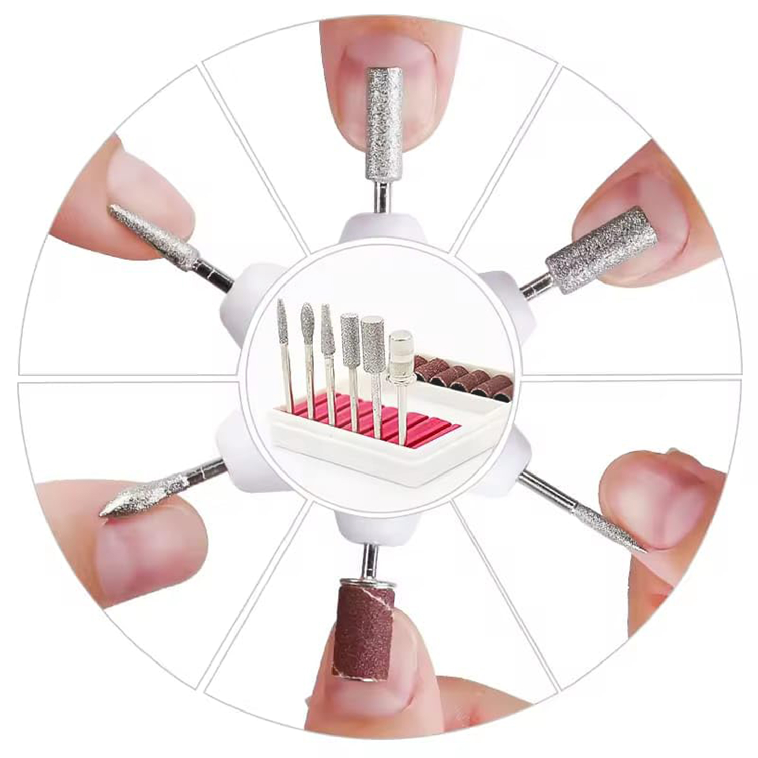 Setul include freze metalice și pile cilindrice, utile pentru diferite etape ale manichiurii și pedichiurii. Aceste accesorii sunt potrivite pentru unghii naturale, unghii cu gel sau acril și pentru lucrări de întreținere periodică. Frezele pot fi schimbate rapid, fără operațiuni complicate, ceea ce optimizează fluxul de lucru.