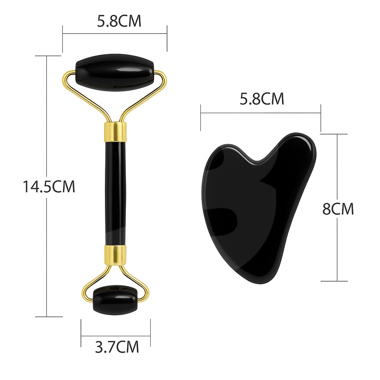 Rollerul din piatră naturală neagră este conceput pentru masaj delicat și uniform, ajutând la relaxarea feței și la îmbunătățirea aspectului pielii. Capetele de dimensiuni diferite permit utilizarea pe zone variate, de la obraji și frunte până la zona ochilor. Placa Gua Sha completează setul, fiind ideală pentru masaj profund, conturare și drenaj facial.