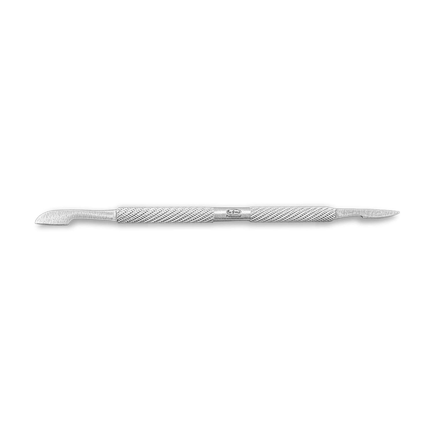 Pe partea opusă se află o lamă îngustă și precisă, ideală pentru curățarea fină a cuticulelor, îndepărtarea pielii uscate, a resturilor aderente sau a produselor exfoliate în timpul manichiurii tehnice. Acest capăt permite tehnicianului să lucreze cu precizie în zonele greu accesibile, menținând un aspect curat și profesional al unghiei naturale înainte de aplicarea oricărui material.
