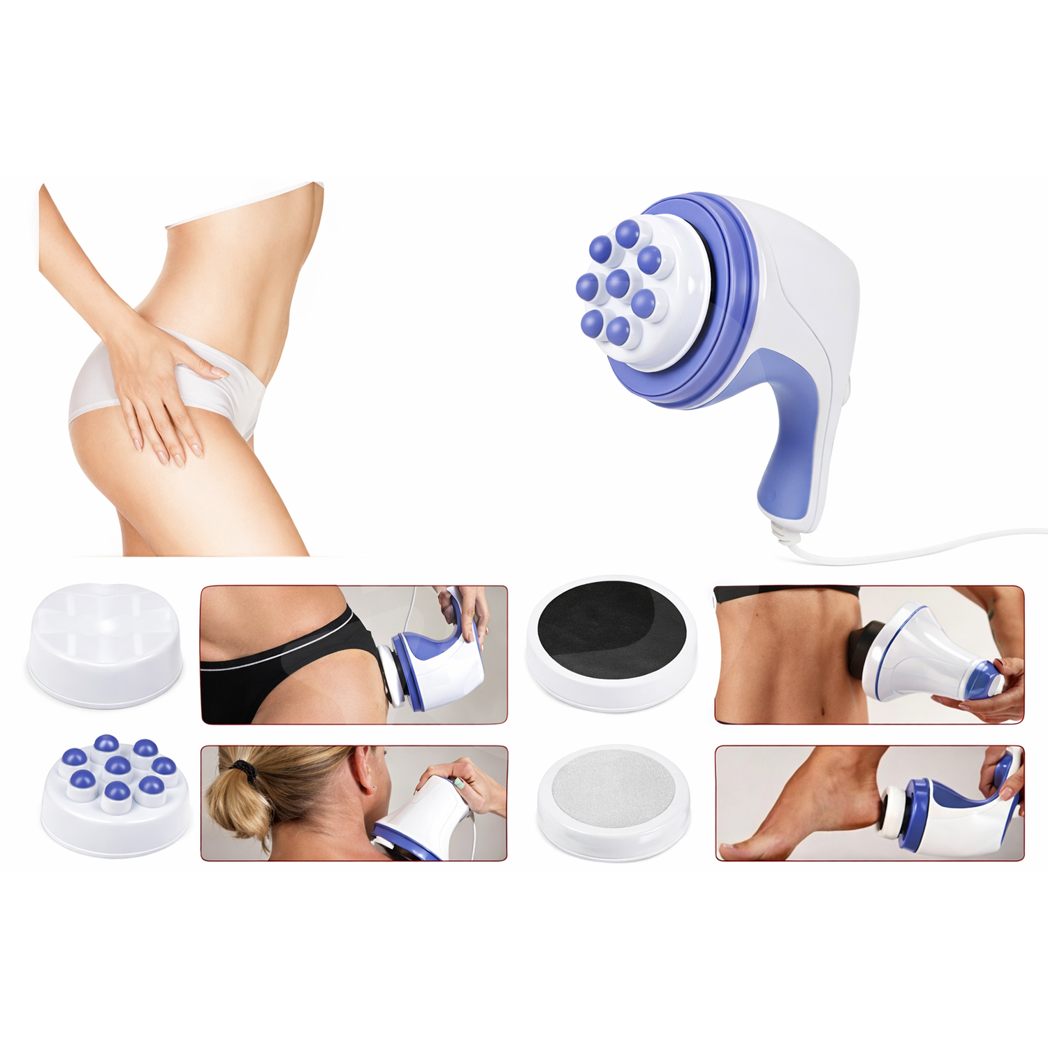 Aparatul este dotat cu 4 capete de masaj interschimbabile, fiecare având o funcție specifică, astfel încât utilizatorul să poată adapta masajul în funcție de zona corpului și de intensitatea dorită. Capul ondulat este recomandat pentru masaj general și relaxare, capul plat este ideal pentru gât, umeri și spate, capul cu bile rotative este destinat masajului profund și poate fi utilizat împreună cu geluri sau uleiuri, iar capul abraziv tip micropilă ajută la îndepărtarea pielii moarte și la netezirea suprafeței pielii.