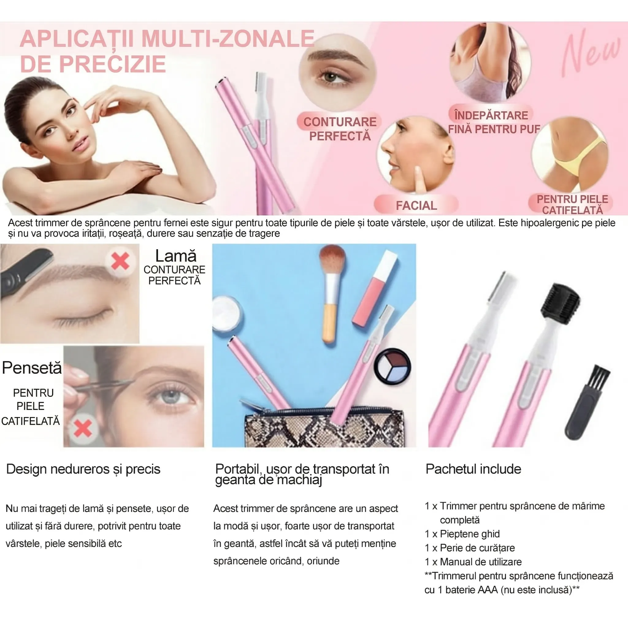 - Sistem 2-în-1 Versatil: Include un cap special pentru conturarea sprâncenelor și un cap de bărbierire fină pentru față și zone delicate.