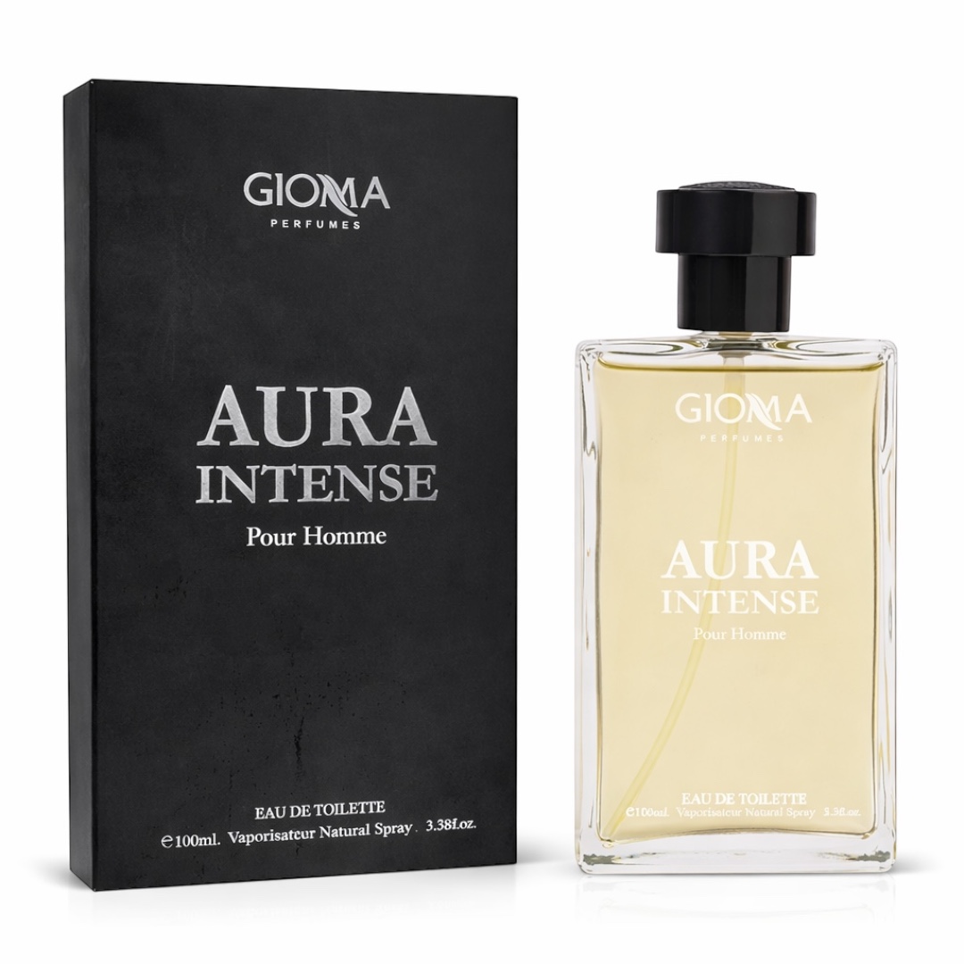 Analizând detaliile vizuale din imagini, Aura Intense adoptă o estetică sobră și luxoasă: flaconul din sticlă transparentă pune în evidență lichidul de un auriu-pai, sugerând o compoziție bogată. Designul este minimalist, având numele „AURA INTENSE” înscris central cu font alb, curat, oferind un contrast excelent și o lizibilitate maximă. Flaconul este dotat cu un capac negru lucios, robust, ce subliniază caracterul premium al produsului. Ambalajul exterior este o cutie neagră mată, cu o textură discretă, pe care numele este marcat cu litere argintii, fiind o piesă de rezistență pentru orice vânzare angro de calitate. Compoziția debutează cu note marine și bergamotă, se dezvoltă cu acorduri de rozmarin și tămâie, și se finalizează pe o bază masculină de patchouli. Volumul de 100 ml (e100ml / 3.3 fl.oz.) garantează o utilizare îndelungată.