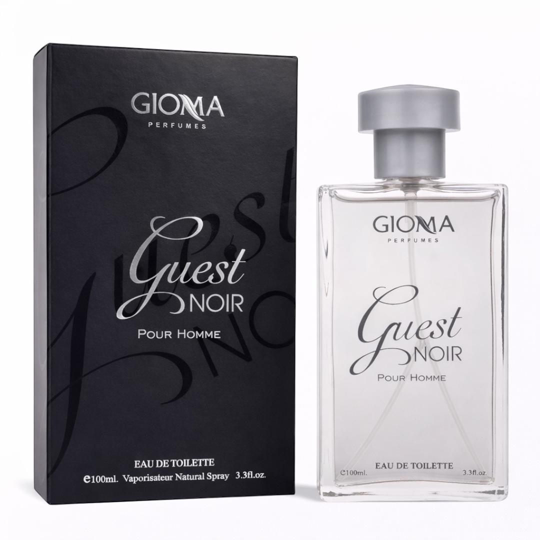 Conform detaliilor vizuale din imagini, Guest Noir adoptă un design minimalist și extrem de profesional: flaconul din sticlă transparentă pune în evidență claritatea esenței, sugerând o prospețime bine structurată. Numele „Guest NOIR” este inscripționat pe flacon cu un font cursiv și elegant, oferind o notă de exclusivitate. Flaconul este echipat cu un capac argintiu mat, de formă cilindrică, ce adaugă un accent metalic modern și masculin. Ambalajul exterior este o cutie de un negru mat profund, pe care este imprimat un grafism subtil și fluid, ce reia numele parfumului, fiind o piesă de rezistență în orice ofertă angro dedicată bărbaților. Compoziția se deschide cu note revigorante de bergamotă și violetă, evoluează spre o inimă caldă de tutun și iasomie, și se așază pe o bază robustă de patchouli, ambră și piele. Volumul de 100 ml (e100ml / 3.3 fl.oz.) asigură o valoare excelentă pentru utilizatorul final.