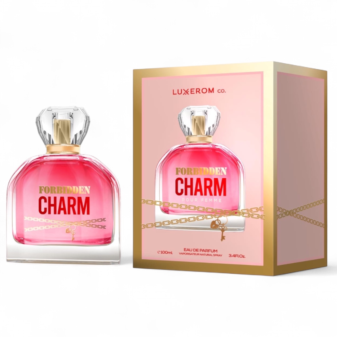 Designul flaconului este unul memorabil și extrem de feminin, prezentând un recipient din sticlă solidă, transparentă, care pune în valoare lichidul de un roz vibrant, sugerând pasiunea și energia din interior. Elementul vizual distinctiv, vizibil pe ambalaj, este reprezentat de grafica frontală: un lanț auriu delicat care înconjoară flaconul, de care atârnă simbolic un lacăt în formă de inimă și o cheie finuță, sugerând ideea unui secret prețios ce urmează a fi descătușat. Numele FORBIDDEN CHARM este imprimat cu caractere bold de culoare roșu aprins, subliniind caracterul provocator al aromei. Pentru partenerii noștri care activează în segmentul vânzărilor angro, acest model sub brandul Luxerom reprezintă o oportunitate strategică imbatabilă, având o estetică ce atrage instantaneu privirea pe orice raft de prezentare.