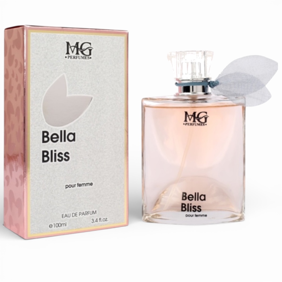 Conform detaliilor vizuale din imagini, produsul beneficiază de o prezentare delicată și feminină: flaconul din sticlă transparentă lasă la vedere lichidul de un roz pal, sugerând finețea aromei. Un detaliu distinctiv este panglica din organza gri-albăstrui legată la baza pulverizatorului, care simbolizează aripile libertății și adaugă un plus de eleganță designului. Ambalajul exterior este o cutie argintie strălucitoare, decorată pe margini cu un model floral roz-cupru, oferind un aspect vizual premium, ideal pentru expunerea în magazinele de profil. Compoziția olfactivă se deschide cu note de coacăze negre și pară, evoluând spre o inimă prețioasă de iris, iasomie și floare de portocal, așezate pe o bază caldă de praline, vanilie și patchouli. Volumul de 100 ml (e100ml / 3.4 fl.oz.) face din Bella Bliss un produs de bază în segmentul de parfumerie angro.