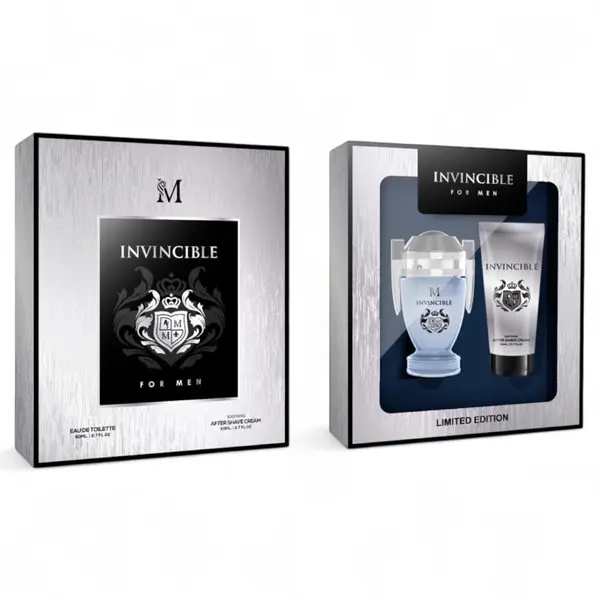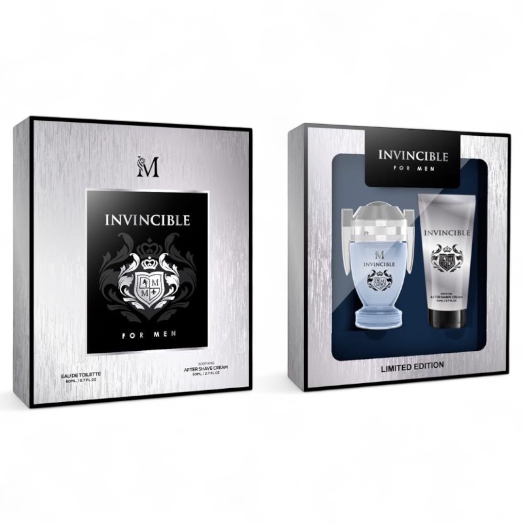 Pentru partenerii noștri din segmentul vânzărilor engros, modelul INVINCIBLE reprezintă un produs cu o rată de succes garantată, profilul de tip „Invictus” fiind constant în topul preferințelor masculine globale. Prezentarea în casetă cu fereastră transparentă permite vizualizarea flaconului în formă de trofeu și a tubului de gel de duș asortat, detalii care atrag imediat atenția cumpărătorilor aflați în căutarea unui cadou de impact. Ambalajul robust și designul sport-chic fac din acest set o alegere versatilă, potrivită atât pentru uzul zilnic, cât și pentru momentele în care un bărbat dorește să emane un plus de încredere și carismă.