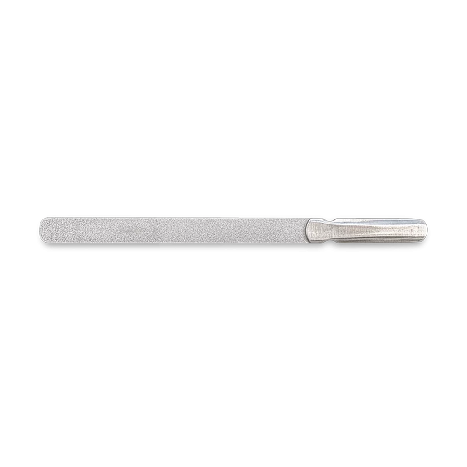 Capătul ergonomic, metalic, cu relief antialunecare, asigură o prindere stabilă și o utilizare confortabilă chiar și în sesiuni de lucru prelungite. Acest detaliu este esențial pentru tehnicienii care au nevoie de precizie constantă și manevrare ușoară. În același timp, pila este suficient de robustă pentru a rezista la uzură intensă, igienizări repetate și contact cu produse specifice manichiurii.