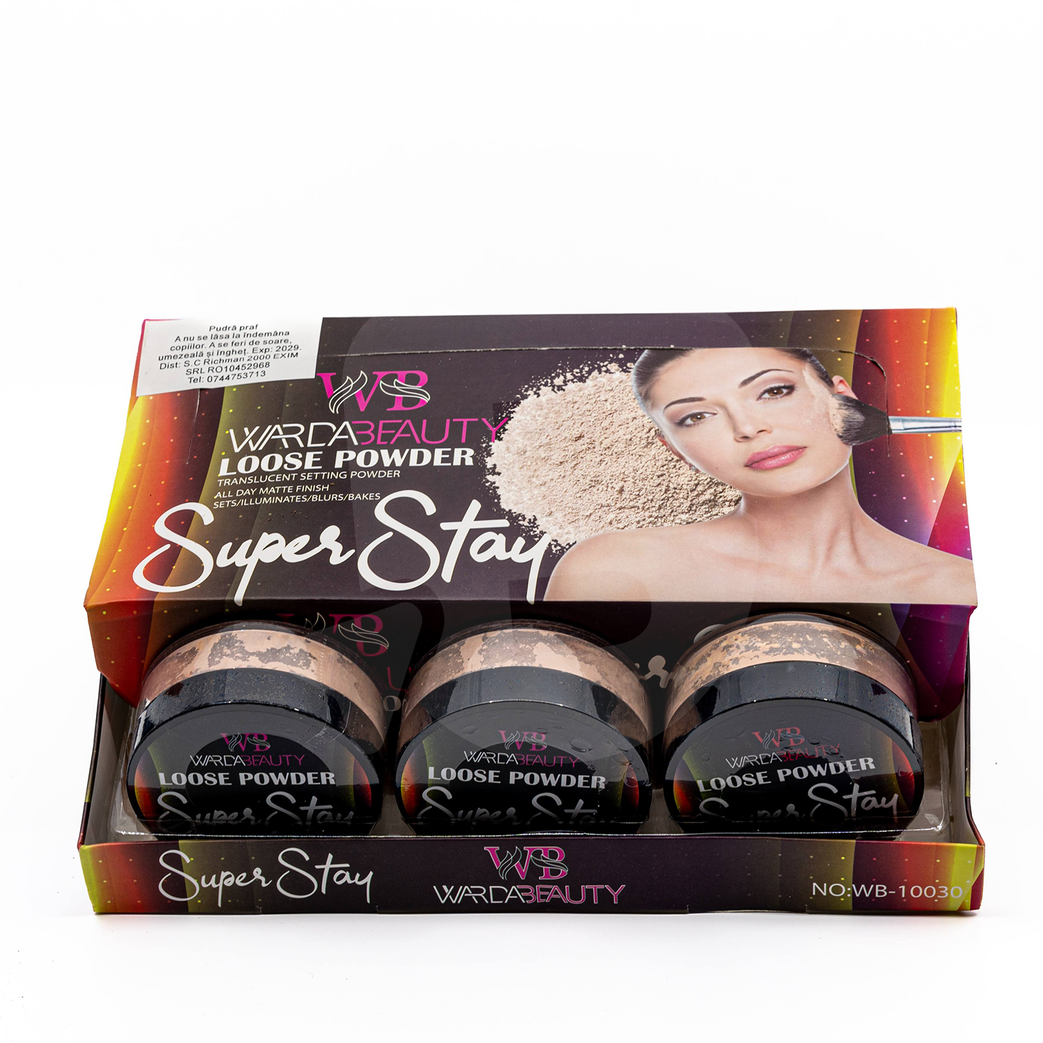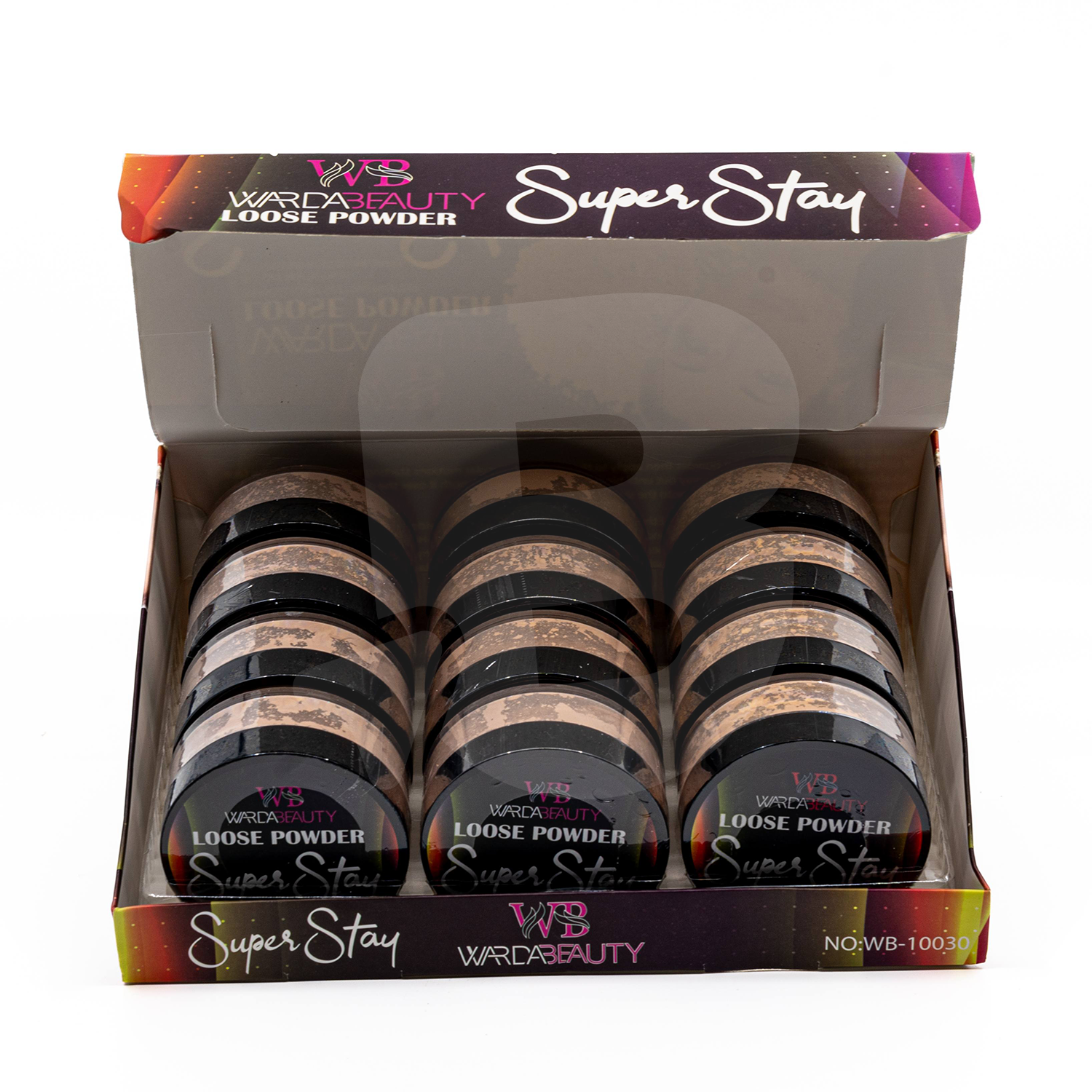 Produsul este ambalat în recipient transparent cu capac negru, exact cum se vede în poze, ceea ce permite vizualizarea nuanței din interior. Cutia de prezentare conține mai multe recipiente individuale, fiind ideală pentru comercianții en-gros și saloane. Pe etichetă este evidențiat brandul WS WardaBeauty, iar mențiunea Loose Powder – Super Stay arată clar că produsul este dedicat fixării machiajului pentru întreaga zi.