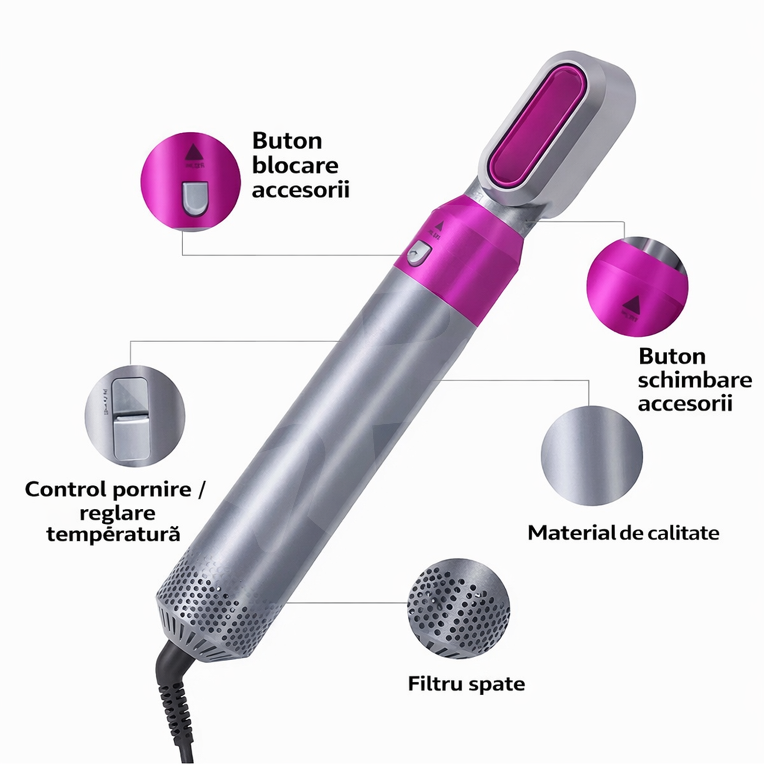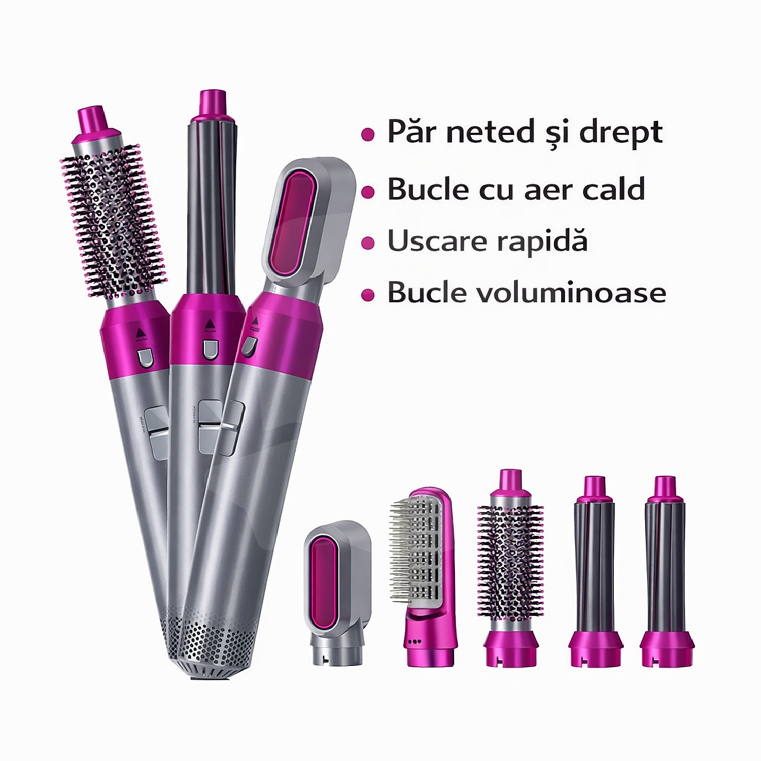 Ondulatorul de păr cu uscător 5 în 1 multifuncțional cu aer cald este un aparat modern de coafare, conceput pentru magazine fizice și online, saloane, revânzători și comercianți care caută produse versatile, cu rotație mare la vânzare, potrivite pentru comercializare en-gros. Acest dispozitiv combină funcțiile de uscare, ondulare, îndreptare, volum și netezire, eliminând nevoia utilizării mai multor aparate separate.