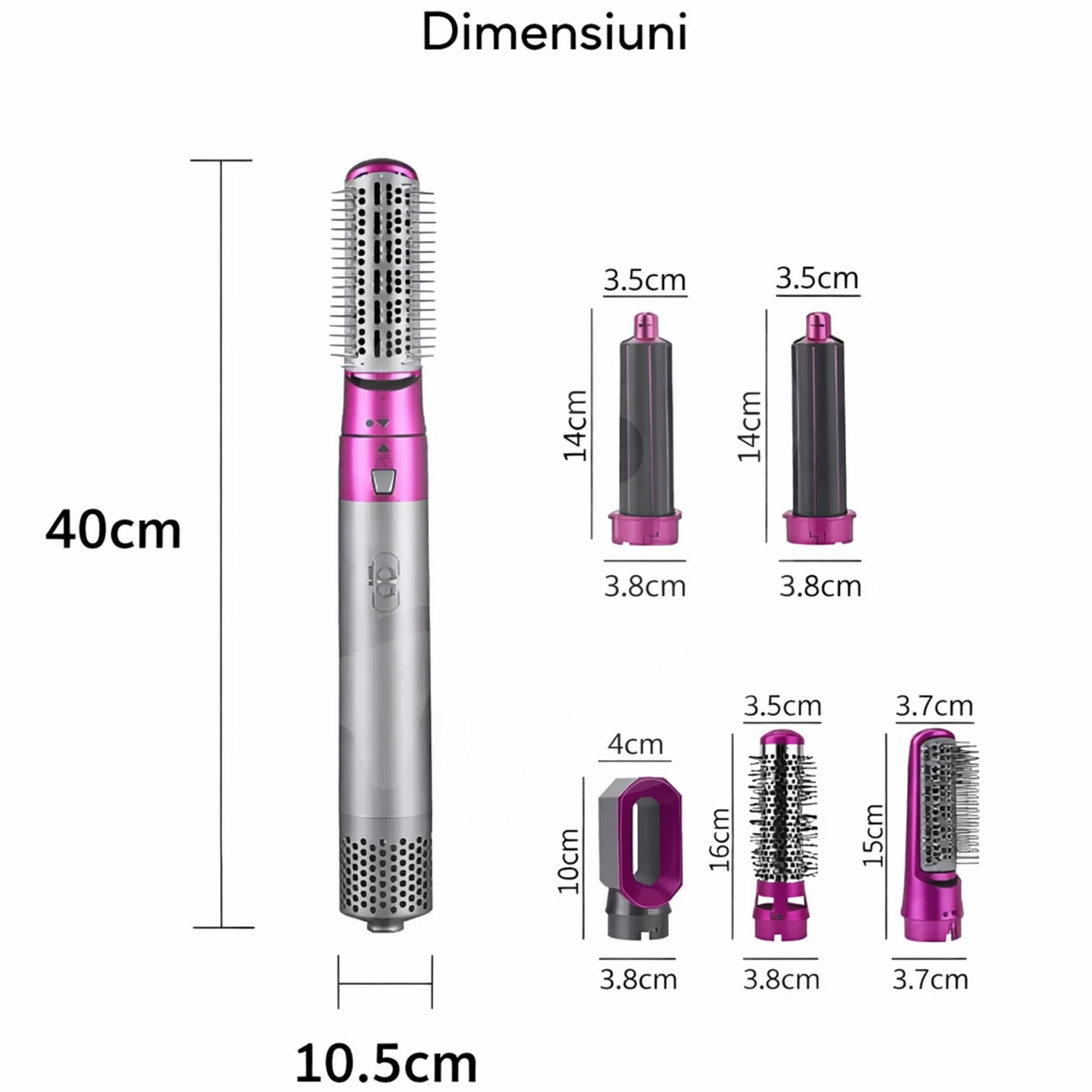 Setul include 5 accesorii diferite, fiecare având un rol bine definit în procesul de coafare. Ondulatoarele cilindrice permit obținerea buclelor și valurilor, peria rotundă oferă volum și formă, peria plată este ideală pentru îndreptare și netezire, iar capul de uscare concentrează fluxul de aer pentru o uscare rapidă. Această diversitate face produsul extrem de căutat în segmentul beauty & hair styling en-gros.