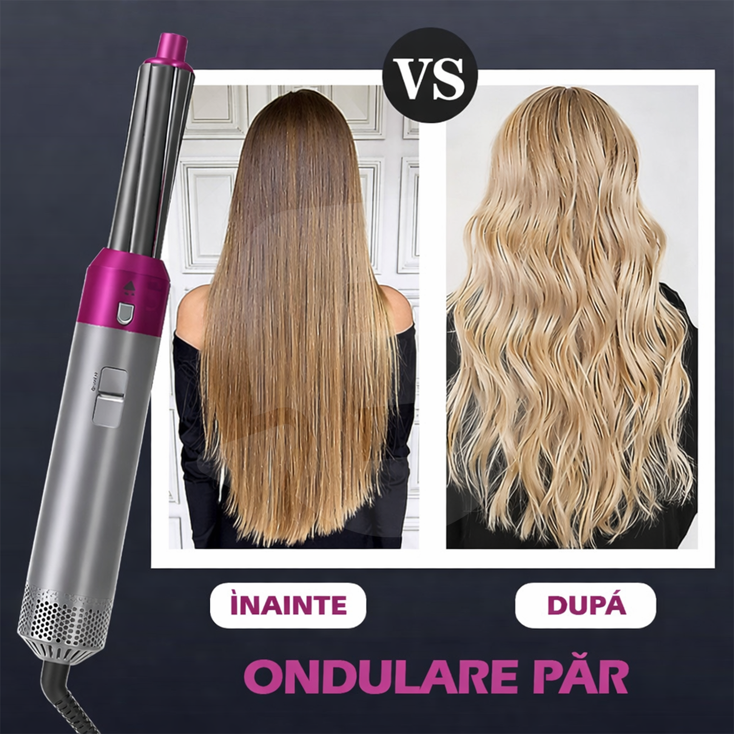 Hot Air Styler-ul este echipat cu 5 accesorii interschimbabile, vizibile în imagini, care permit adaptarea rapidă la diferite tipuri de coafuri și tipuri de păr. Datorită fluxului de aer cald direcționat, părul este modelat uniform, fără supraîncălzire excesivă, obținând un rezultat neted, ondulat sau drept, în funcție de accesoriul utilizat.