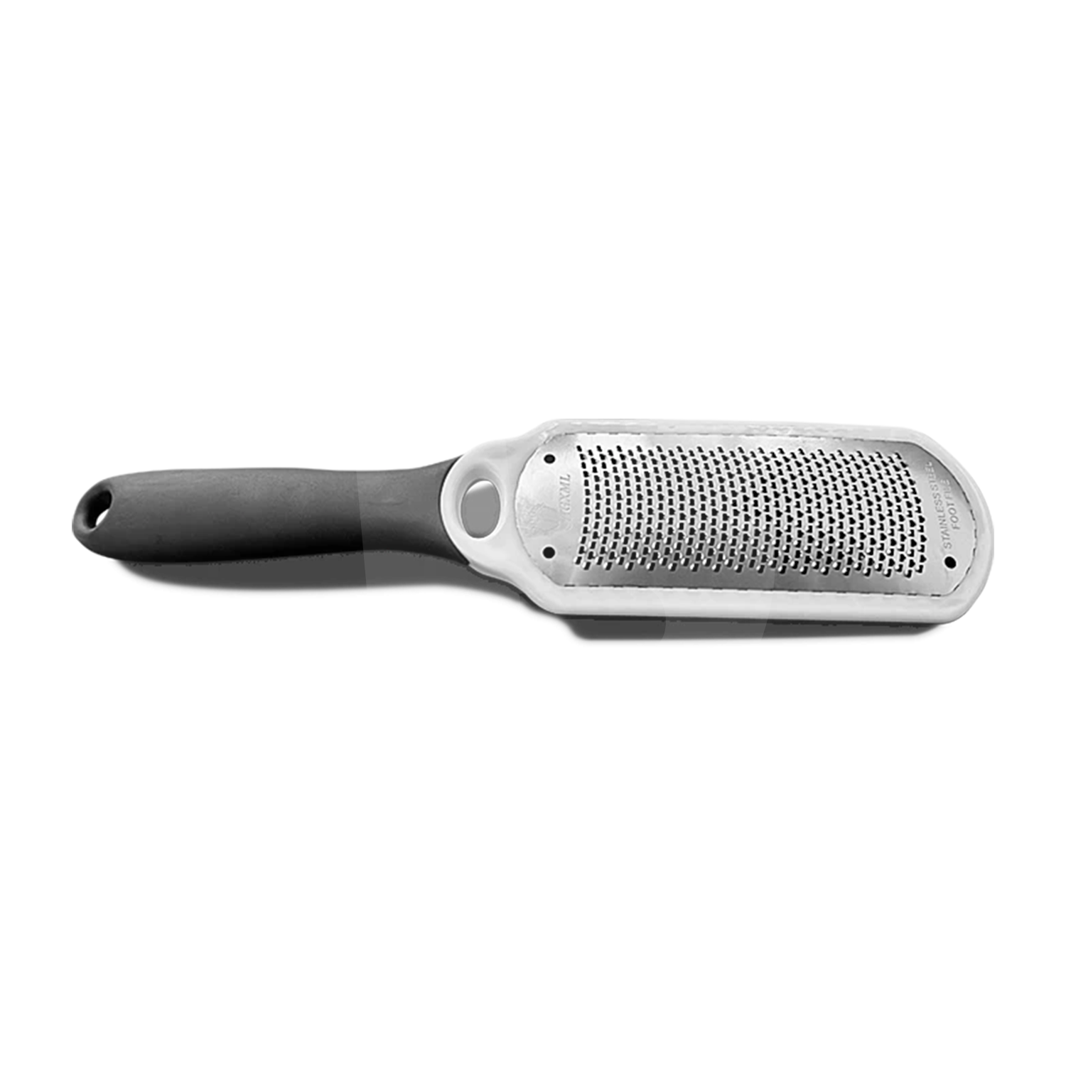 Suprafața activă a răzuitorului este formată dintr-o placă metalică cu micro-perforații curate și dense, realizate prin tăiere mecanică de precizie. Aceste perforații permit eliminarea uniformă a pielii îngroșate, fără riscul de smulgere sau alunecare. Forma ușor curbată a plăcii metalice se adaptează foarte bine la structura tălpii, oferind o exfoliere rapidă, sigură și consistentă, ceea ce face ca acest model să fie preferat în saloanele profesionale.
