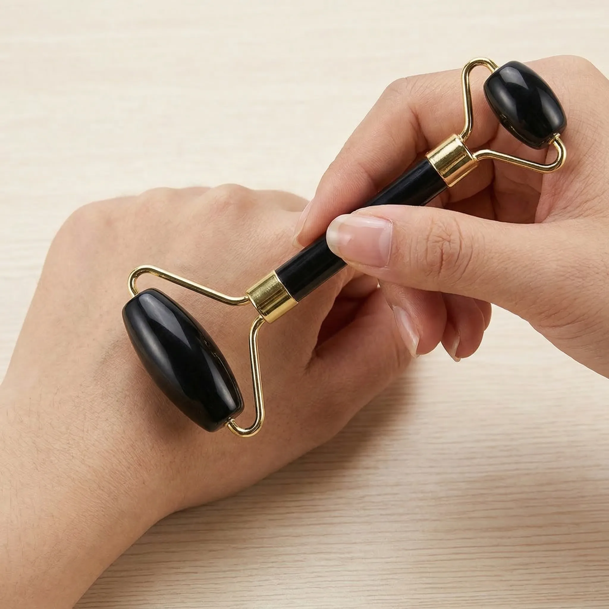 Realizate manual din piatră naturală de jad negru de cea mai înaltă calitate, rola facială și piatra Gua Sha sunt instrumente esențiale pentru orice rutină de beauty modernă. Jadul negru, recunoscut pentru proprietățile sale calmante și echilibrante, ajută la detoxifierea pielii prin stimularea drenajului limfatic, eliminând eficient toxinele și reducând retenția de apă care cauzează umflăturile feței.