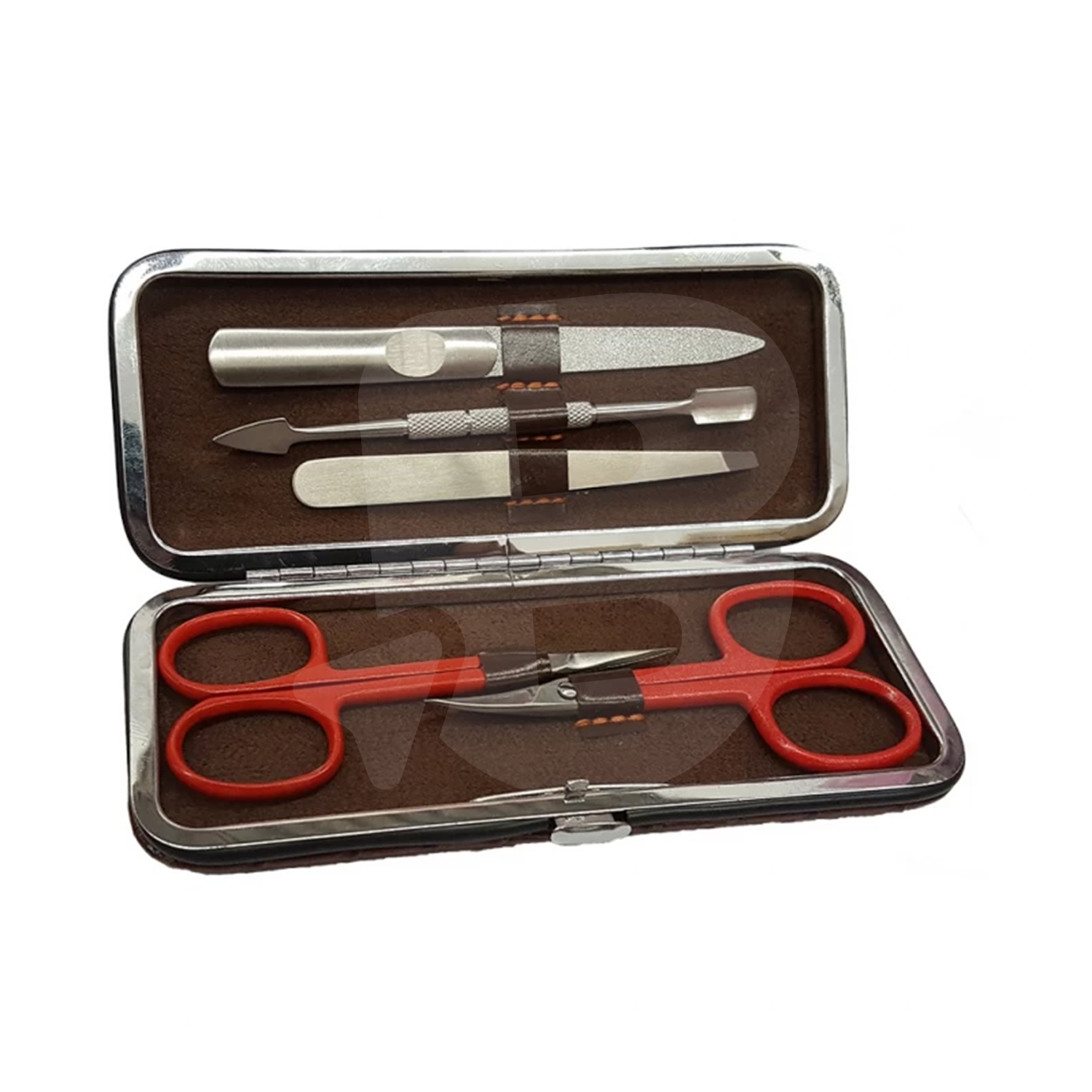 Setul include cinci instrumente esențiale, fiecare plasat în interiorul unei carcase elegante cu interior maro și prinderi din piele ecologică întărită. Carcasa metalică oferă protecție superioară, astfel încât instrumentele rămân bine fixate și ferite de deteriorări în timpul transportului. În partea superioară se disting clar o pilă metalică, un împingător pentru cuticule, un instrument pentru curățare fină și un cuțitaș metalic pentru îngrijirea cuticulelor, toate realizate din oțel inoxidabil de calitate, cu texturi antiderapante care asigură control și precizie. Fiecare unealtă este concepută pentru intervenții exacte, fie că vorbim despre netezirea unghiei, îndepărtarea cuticulelor sau finisarea marginilor.