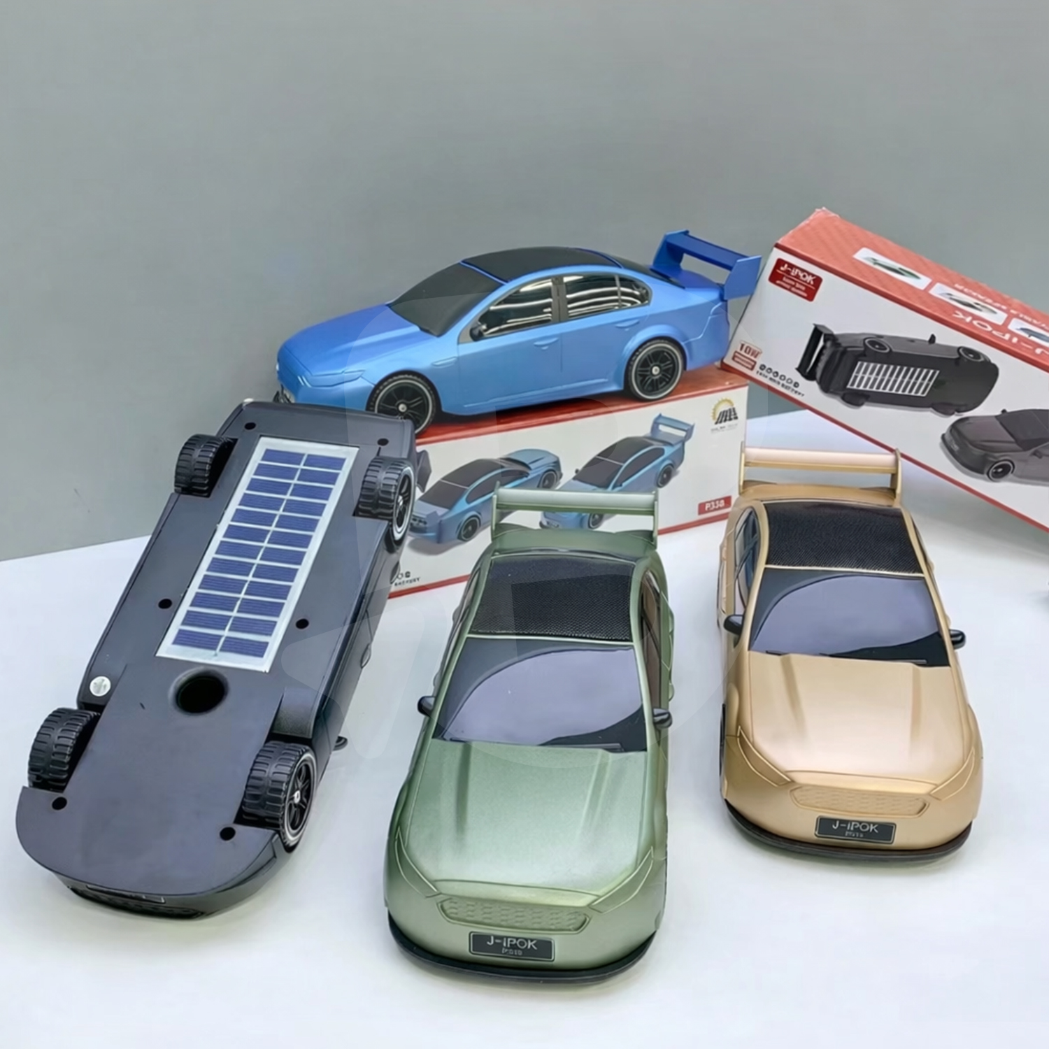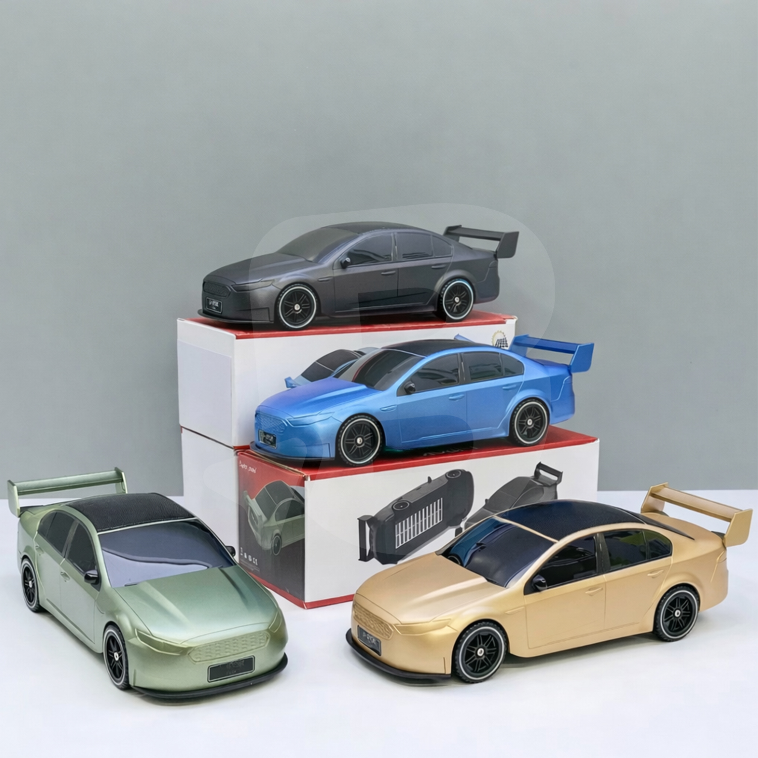 Toate variantele de culoare păstrează același design tip mașină sport, cu carcasă din plastic, eleron spate și detalii negre pentru geamuri și roți, diferența fiind strict cromatică. Acest aspect face produsul potrivit pentru vânzare en-gros, ca articol unic cu opțiuni de culoare selectabile.
