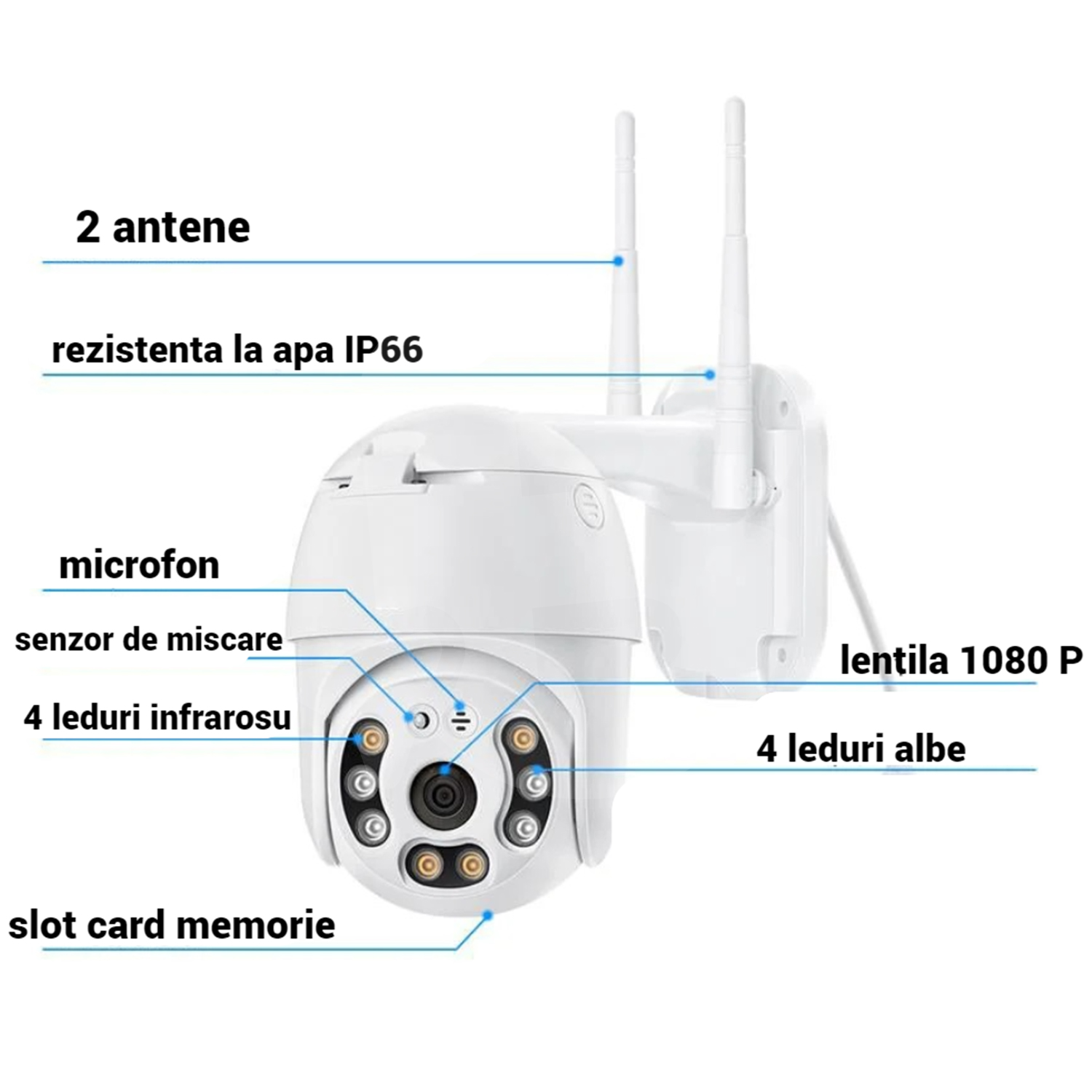 Sistemul de detecție a mișcării identifică automat activitatea suspectă și poate trimite notificări instant pe telefon. În momentul detectării mișcării, camera poate începe înregistrarea automată pe cardul de memorie (suportă card SD până la 128 GB, neincluse), asigurând stocarea evenimentelor importante.