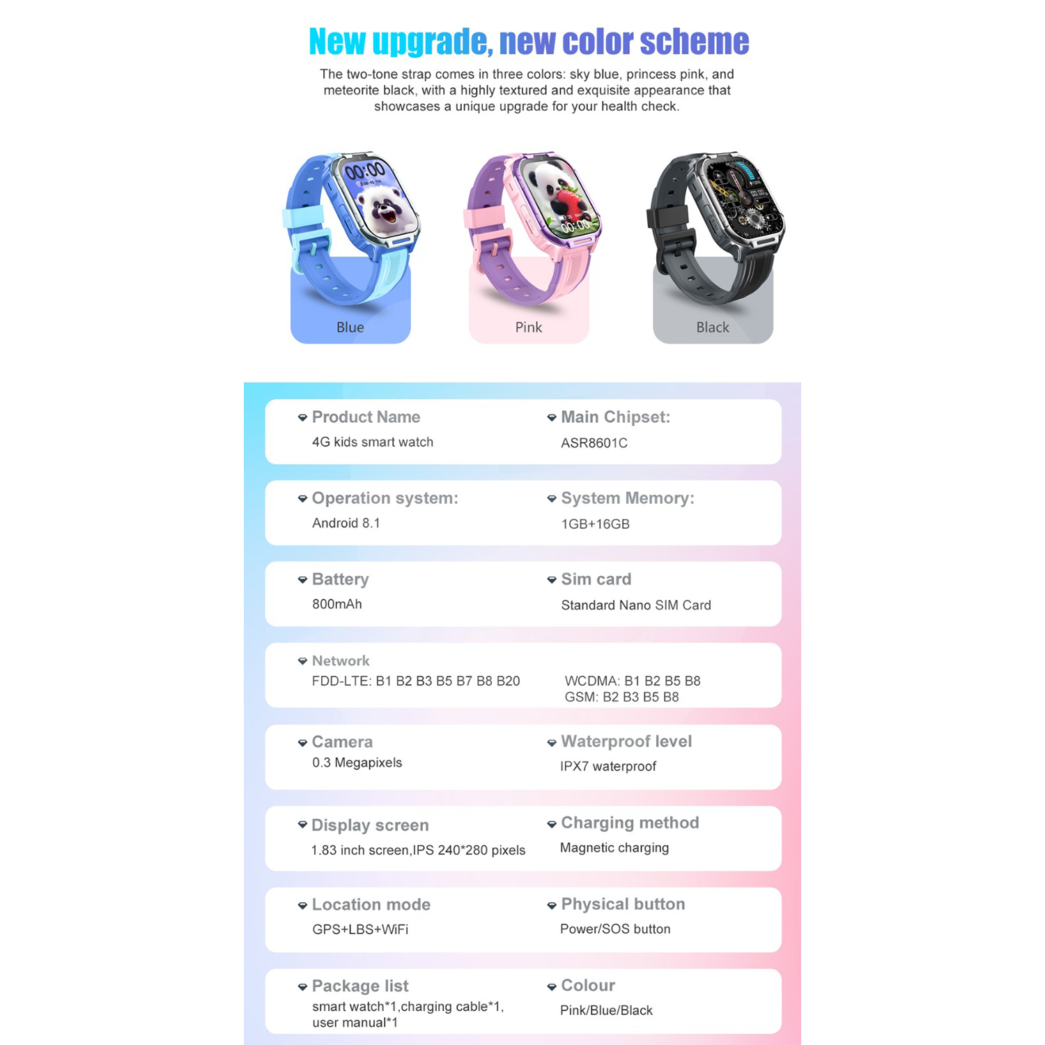 Smartwatch 4G pentru copii cu GPS, apel video, SOS, monitorizare somn, pedometru, cameră și localizare WiFi. Rezistent la apă IPX7, ecran 1.83" și baterie 800 mAh. Ideal pentru siguranță și comunicare.