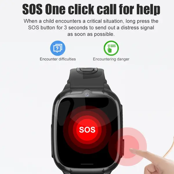 Funcția de SOS este una dintre cele mai importante elemente ale ceasului. Copilul trebuie doar să apese și să mențină apăsat butonul pentru 3 secunde, iar dispozitivul inițiază automat apeluri către contactele prestabilite și trimite alerte în aplicație.