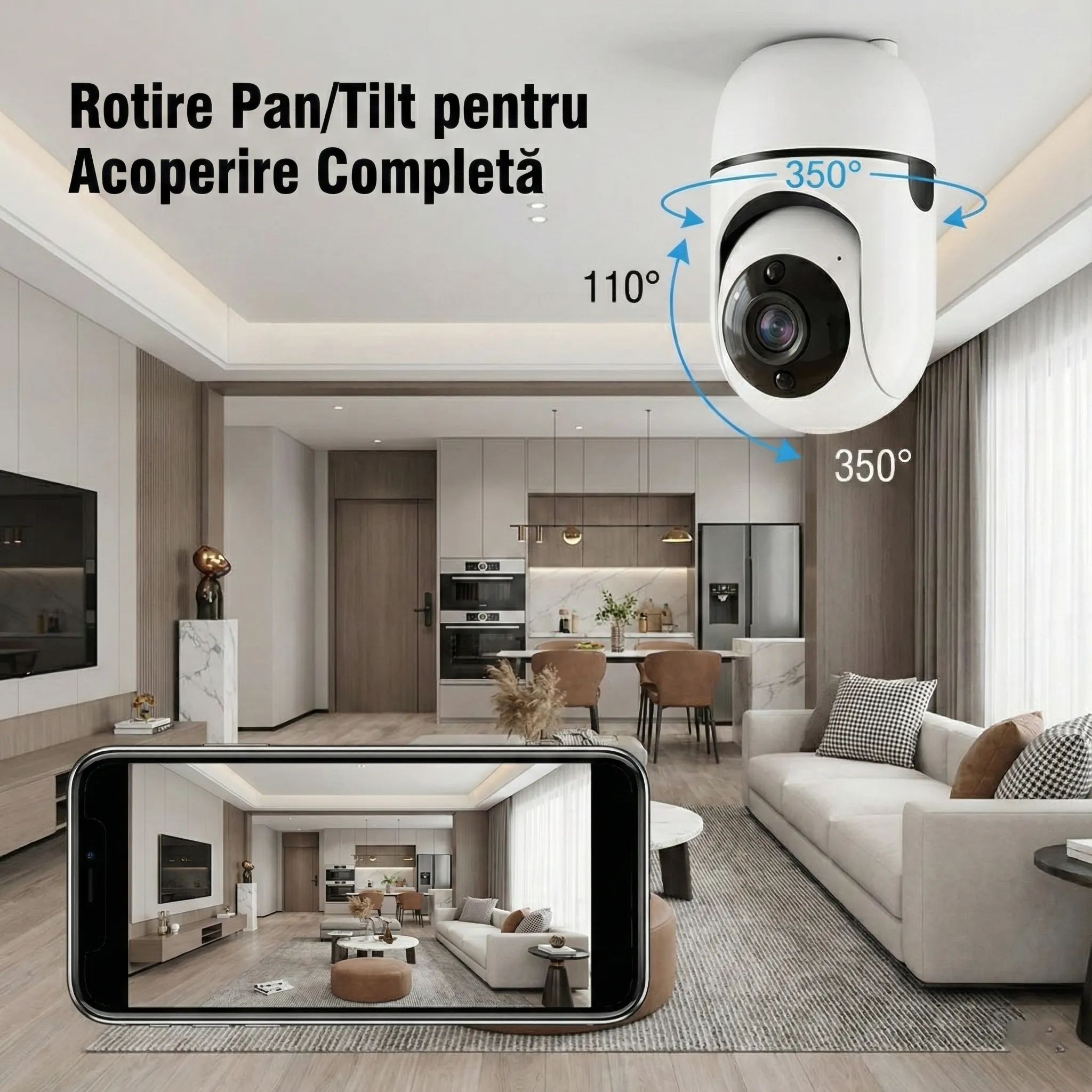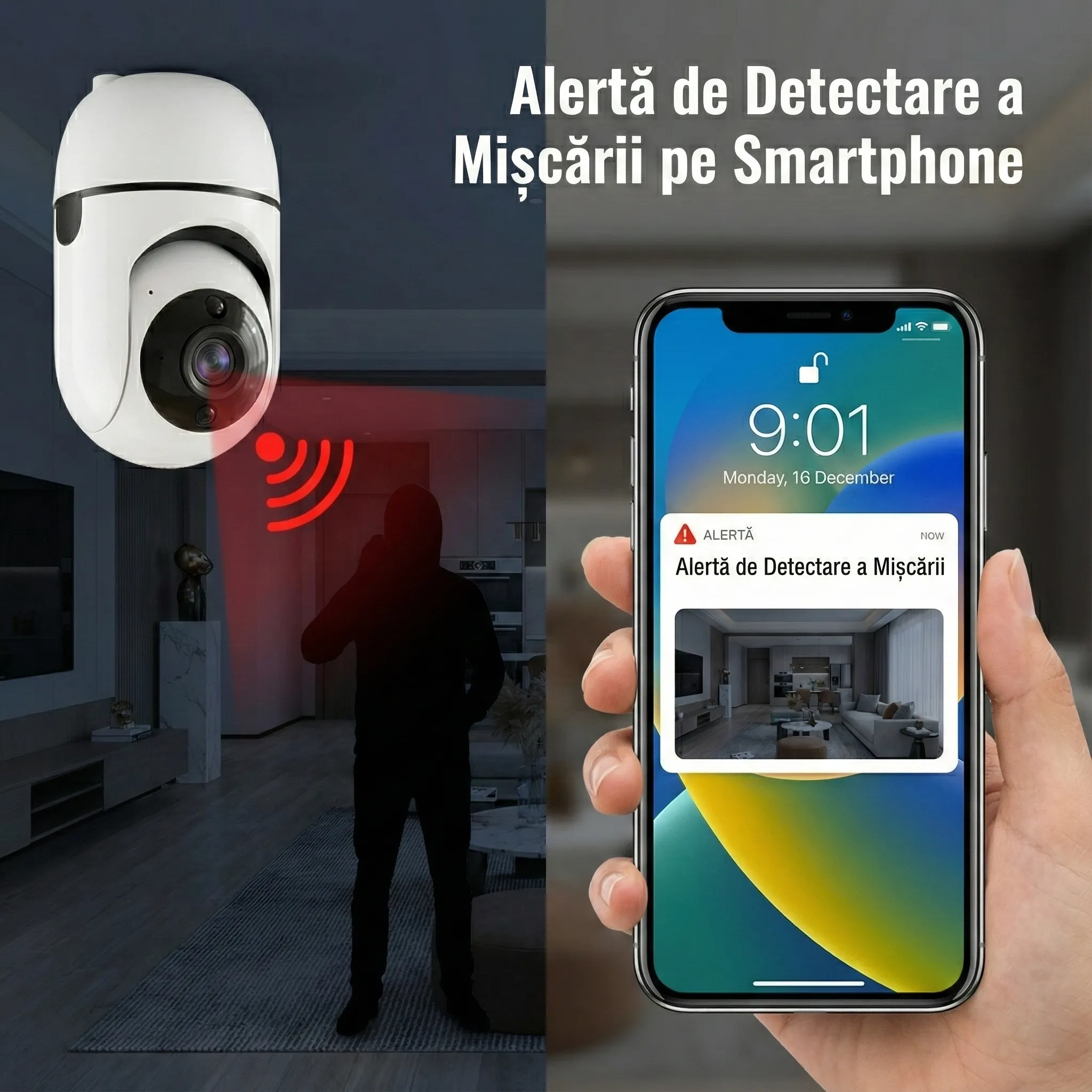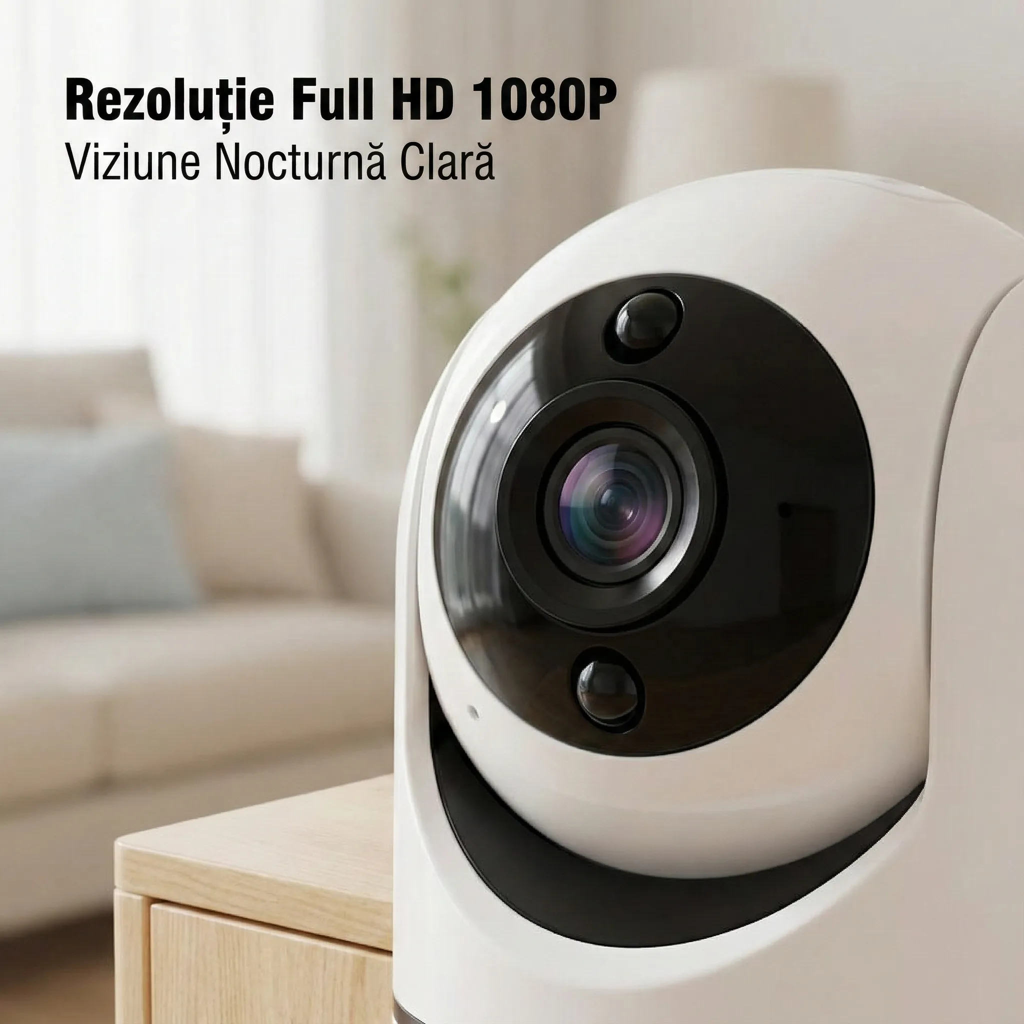 - Alerte: Detectare mișcare și sunet, notificare în aplicație