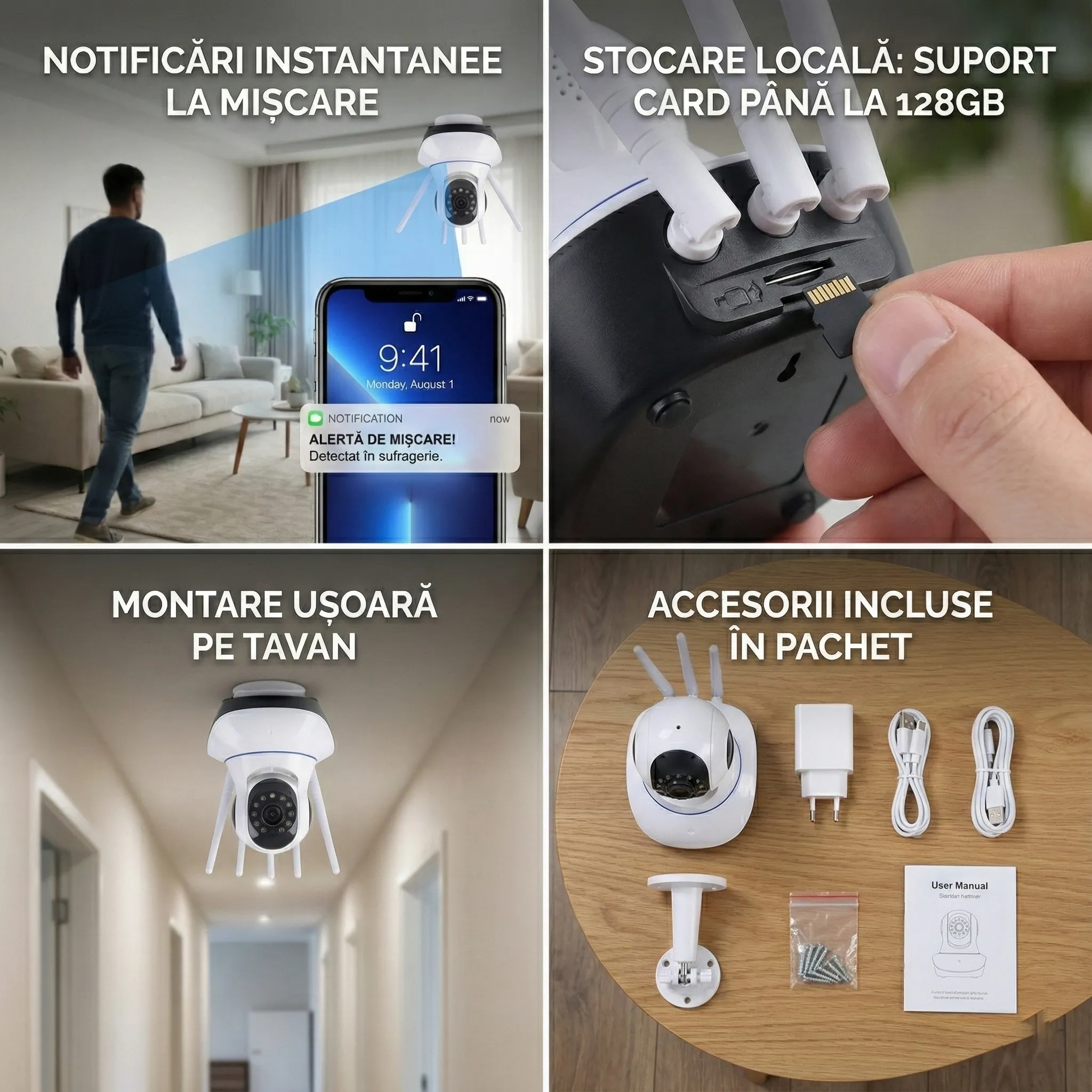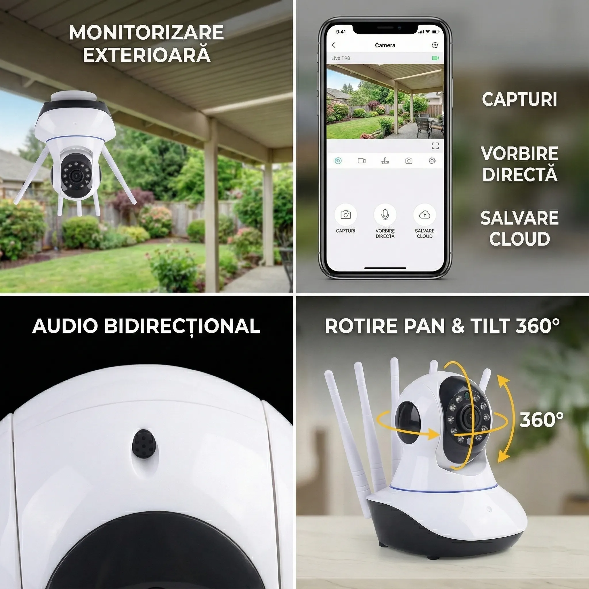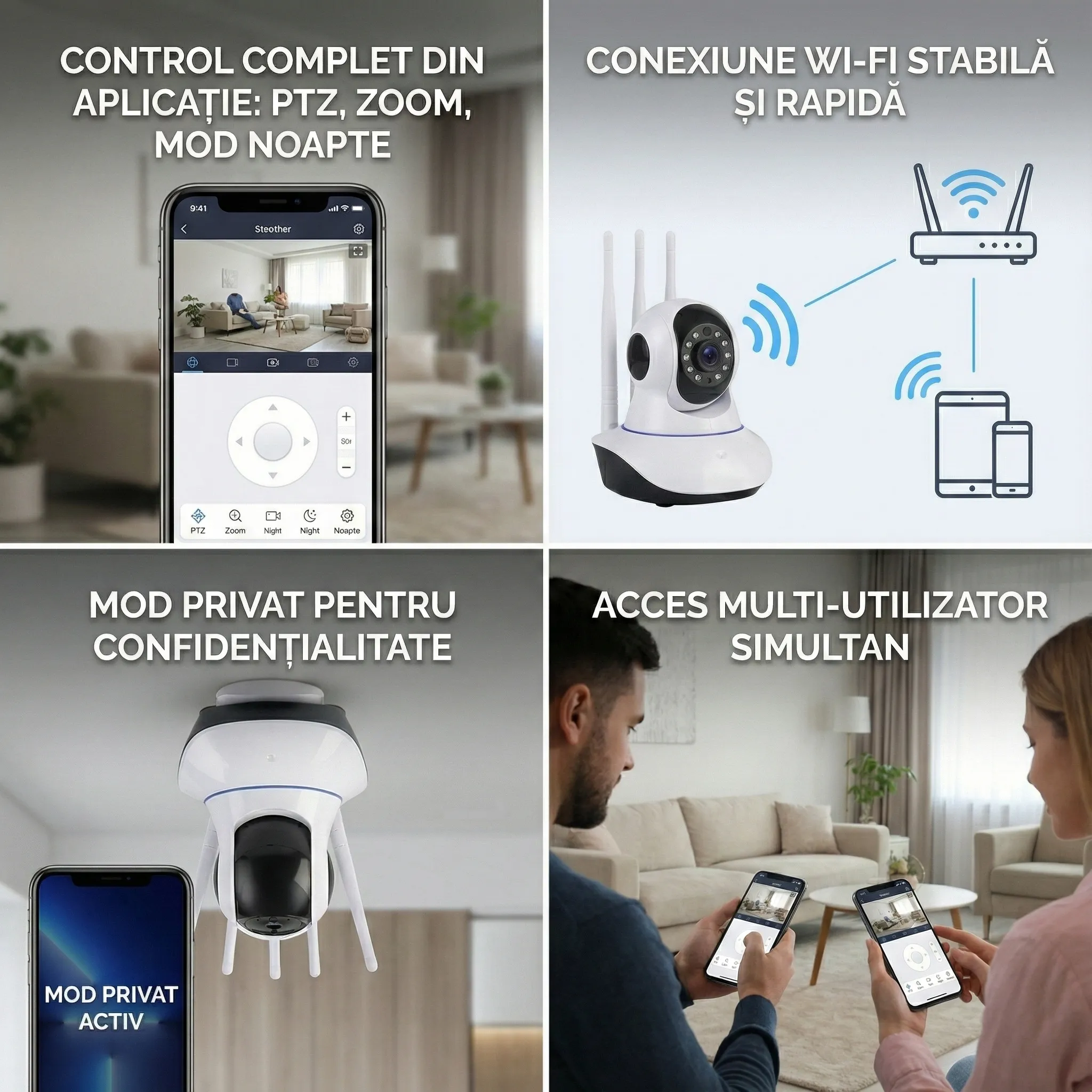 Îți faci griji pentru siguranța locuinței când ești plecat sau vrei să monitorizezi activitatea de la birou în timp real? Această cameră de supraveghere inteligentă este gardianul tău digital de încredere. Diferența majoră o fac cele 5 antene puternice, care asigură o conexiune WiFi extinsă și stabilă, eliminând riscul deconectărilor exact când ai nevoie de ea.