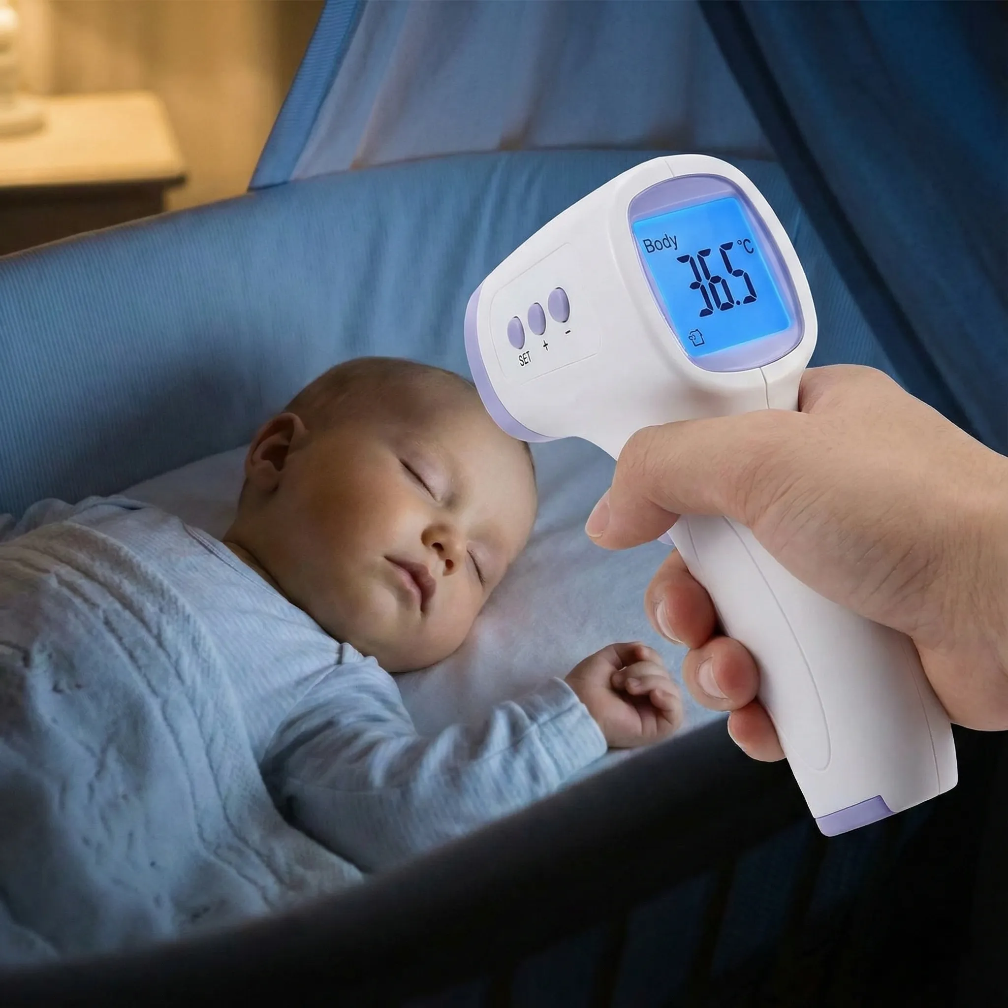Ecranul mare, iluminat, asigură o vizibilitate excelentă chiar și în întuneric total, astfel încât să nu fii nevoit să aprinzi lumina în camera copilului. Aparatul este dotat și cu o avertizare sonoră rapidă care te anunță imediat în cazul în care detectează o temperatură ridicată (febră).