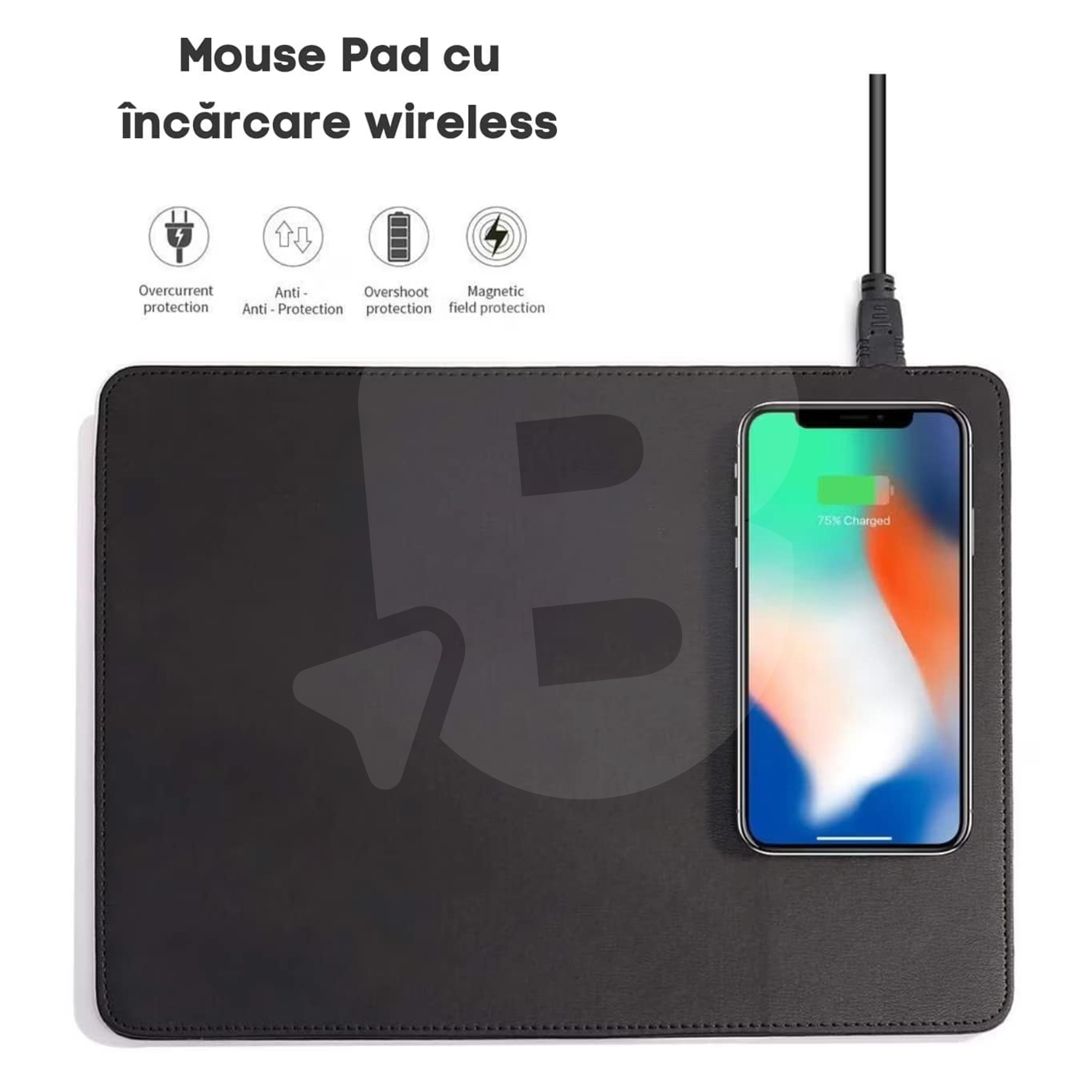 Suprafața plată, complet uniformă, permite utilizarea confortabilă a mouse-ului pe întreaga arie, fără denivelări, cusături incomode sau zone care să afecteze precizia. Zona de încărcare wireless este integrată discret, fără găuri sau elemente reliefate, ceea ce face ca mouse pad-ul să fie potrivit atât pentru muncă intensivă, cât și pentru utilizare zilnică.
